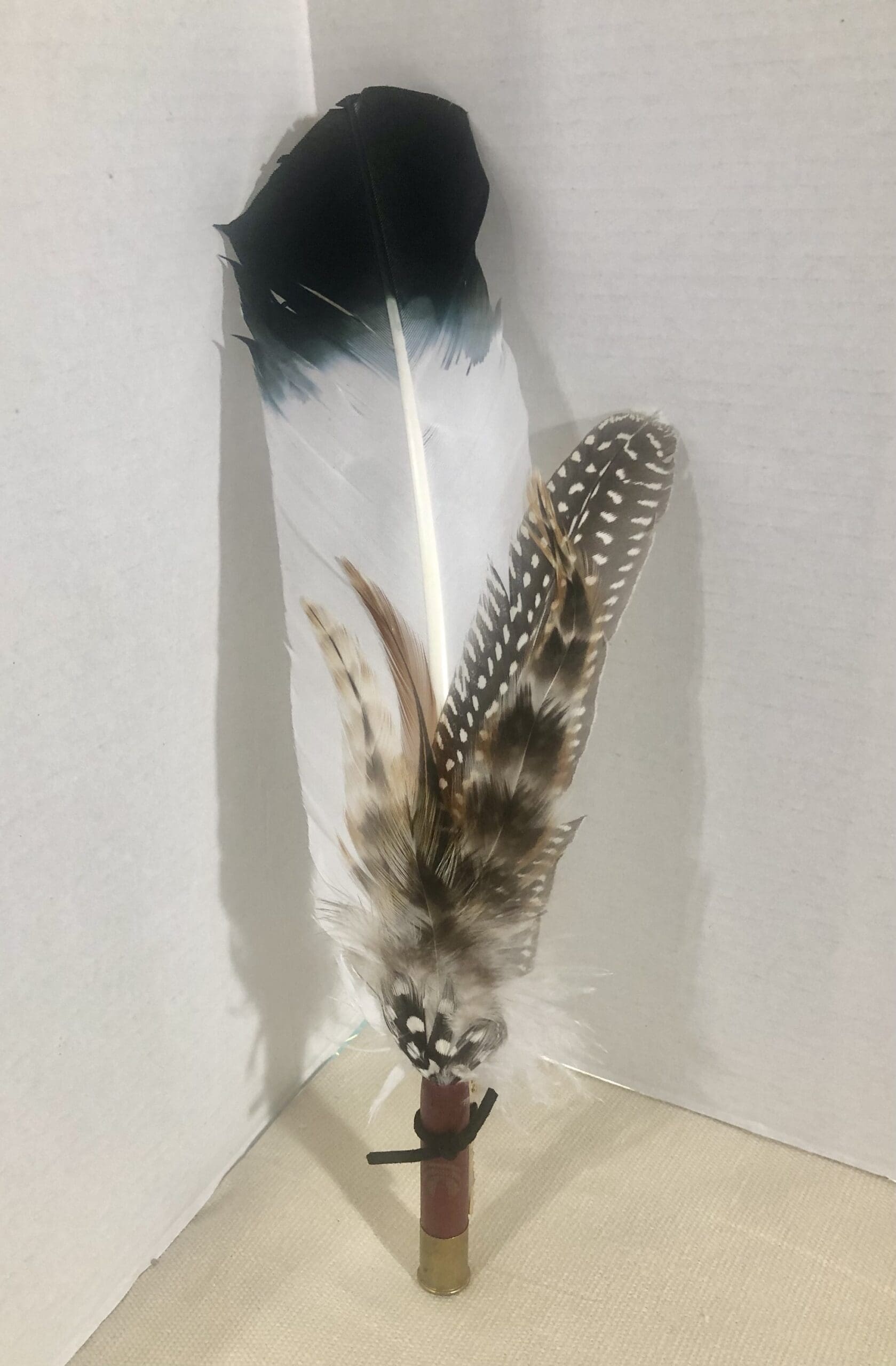 Beautiful black and white feather accented with pheasant feathers all attached to a spent shotgun shell.