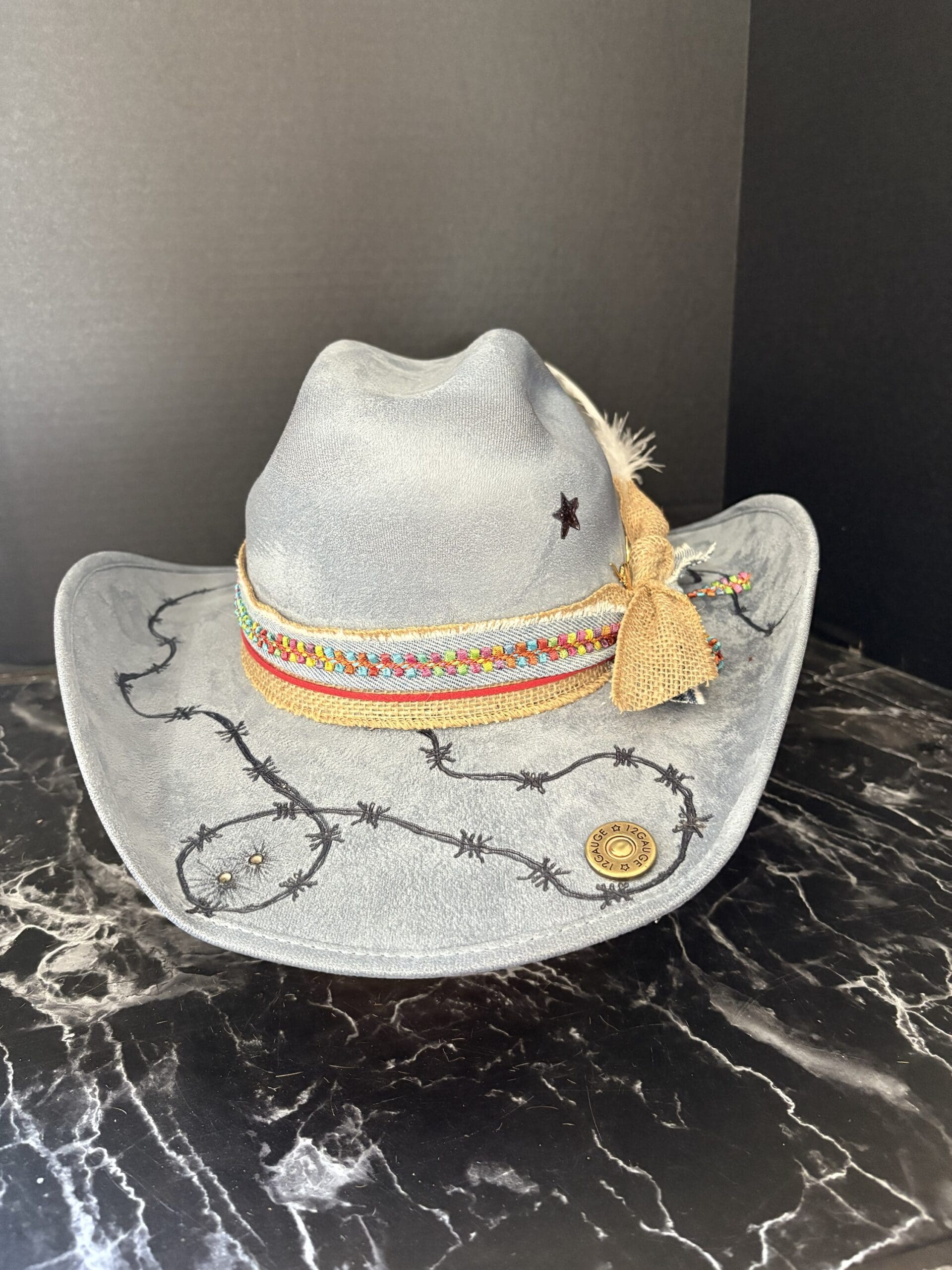 It definitely will let them know who’s in control from the burnt barbed wire to the 12 gauge shell in the brim along with the two burnt bullet holes..