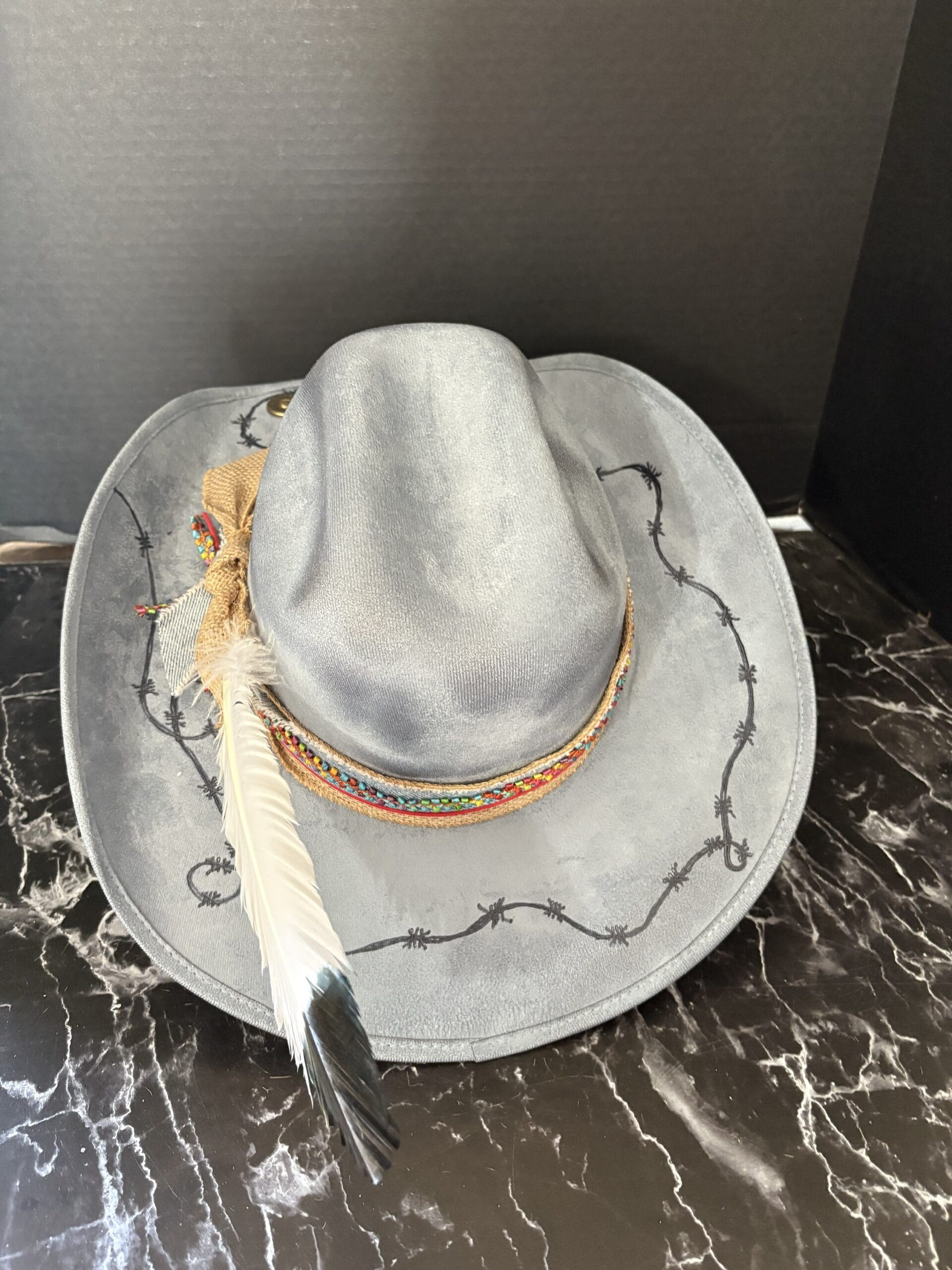 The hatband is made up of burlap, old denim jeans, red leather latigo and different colors of braided leather. Tied off with a steer head and an eagle feather to finish it off.