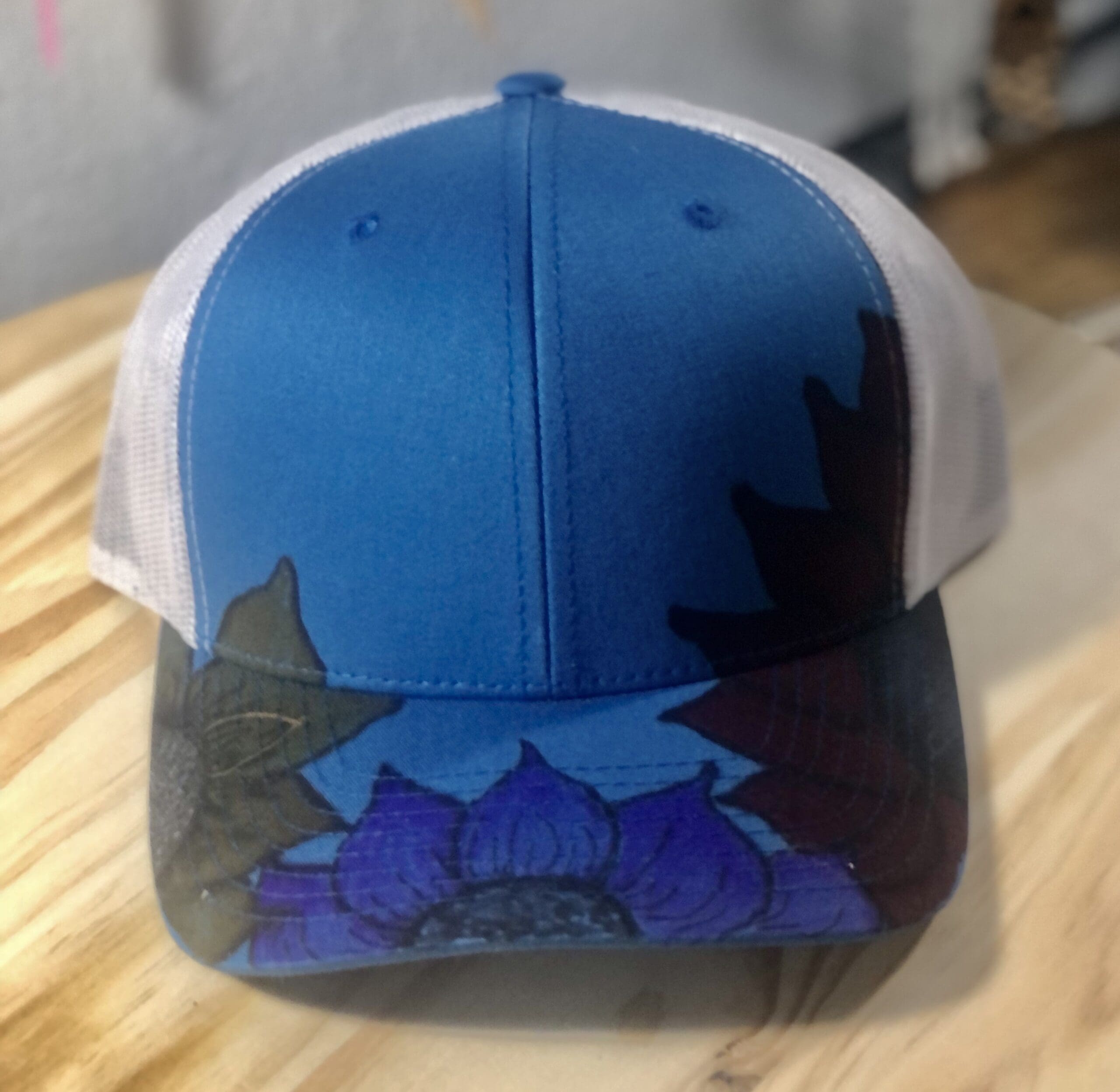 Steel blue handpainted truckers cap. Brim and crown covered in a floral design