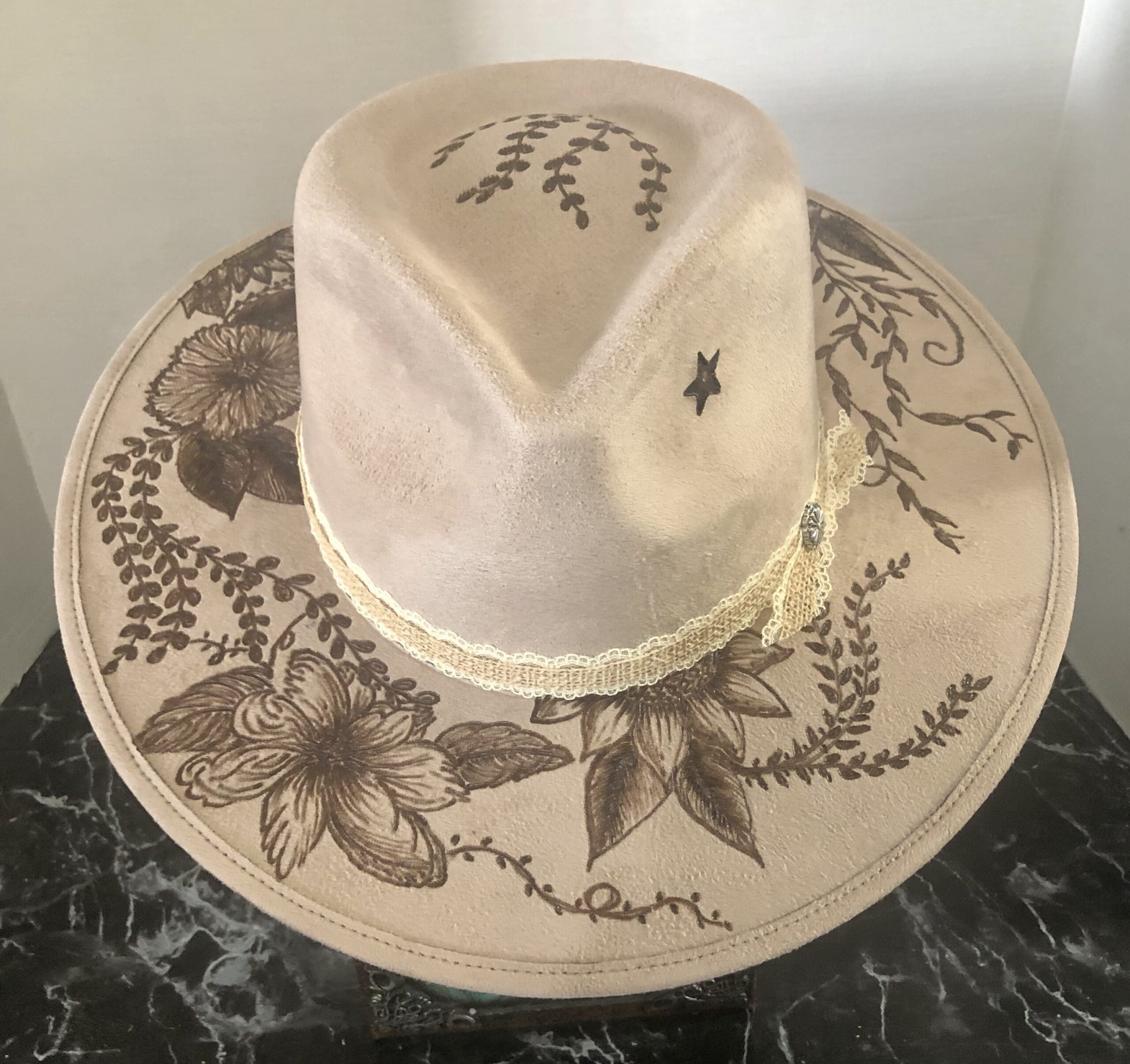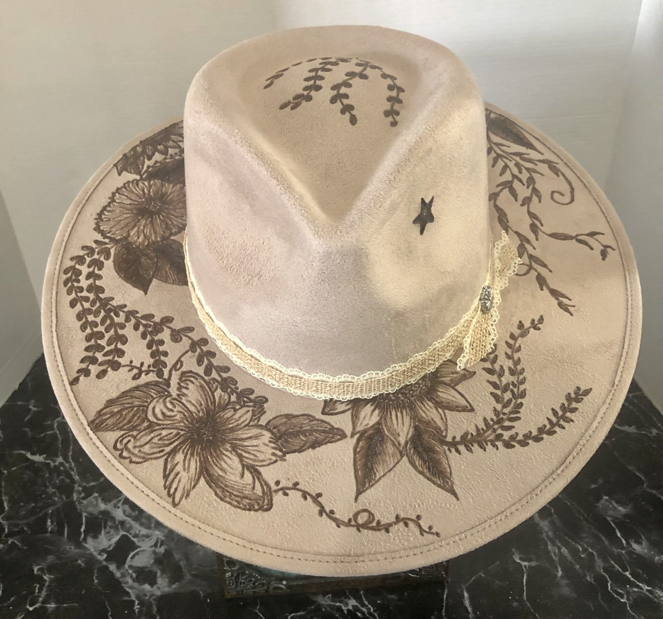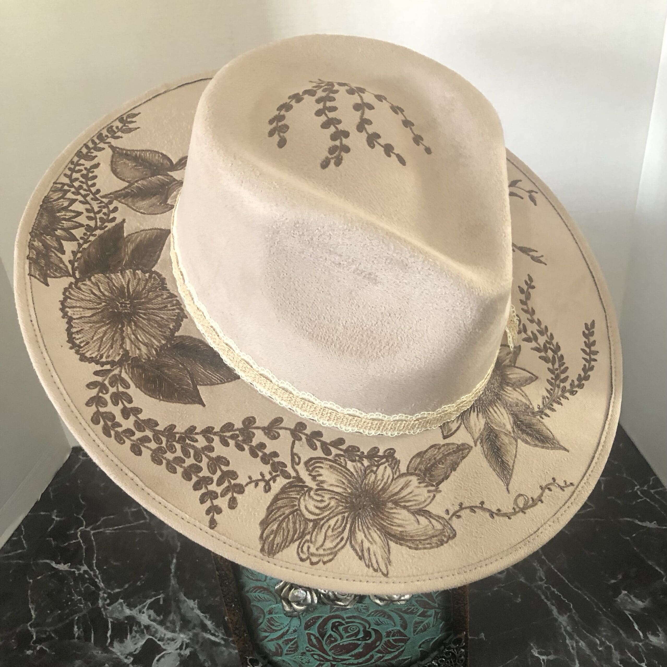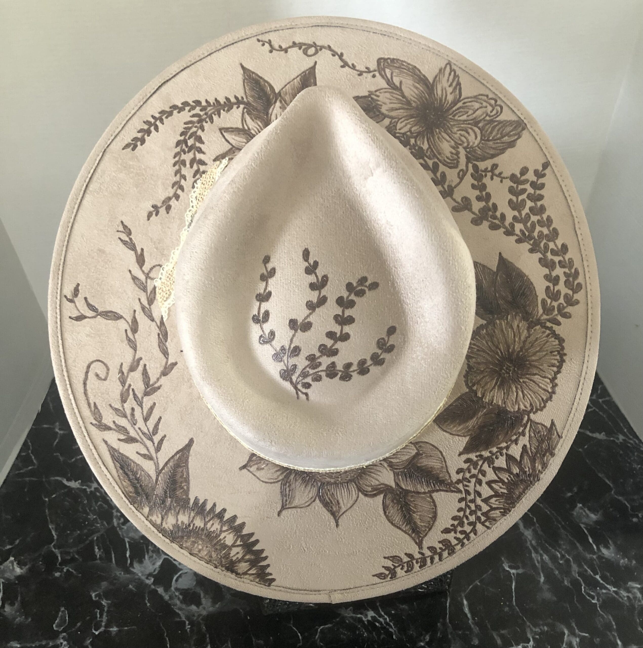 The brim is burnt with a simple floral design of sunflower, pansies, crawling vines, and daisies.
