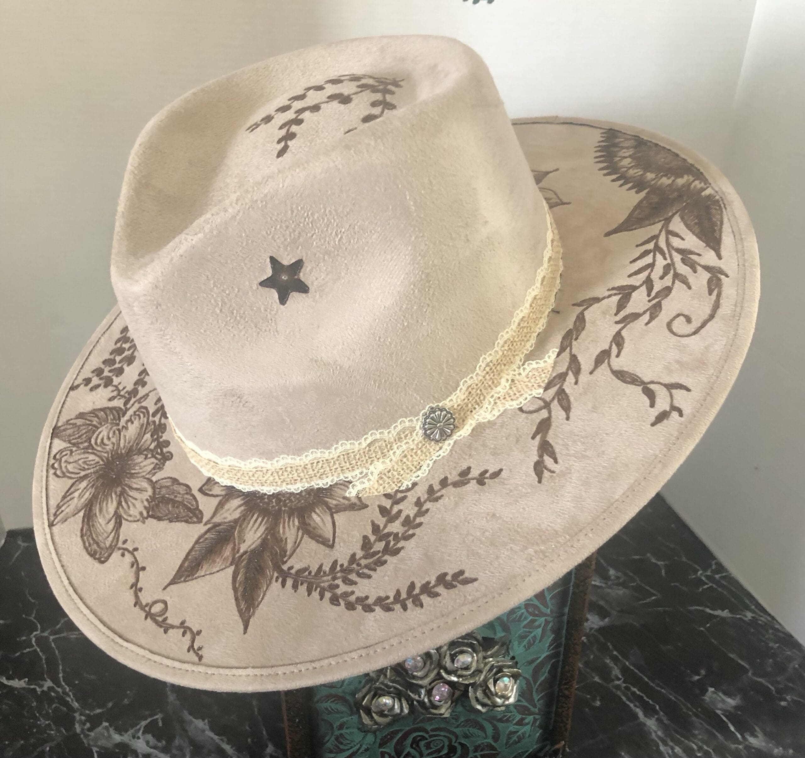 A clean lace and burlap hatband completes the look with a delicate silver concho finishing it off.
