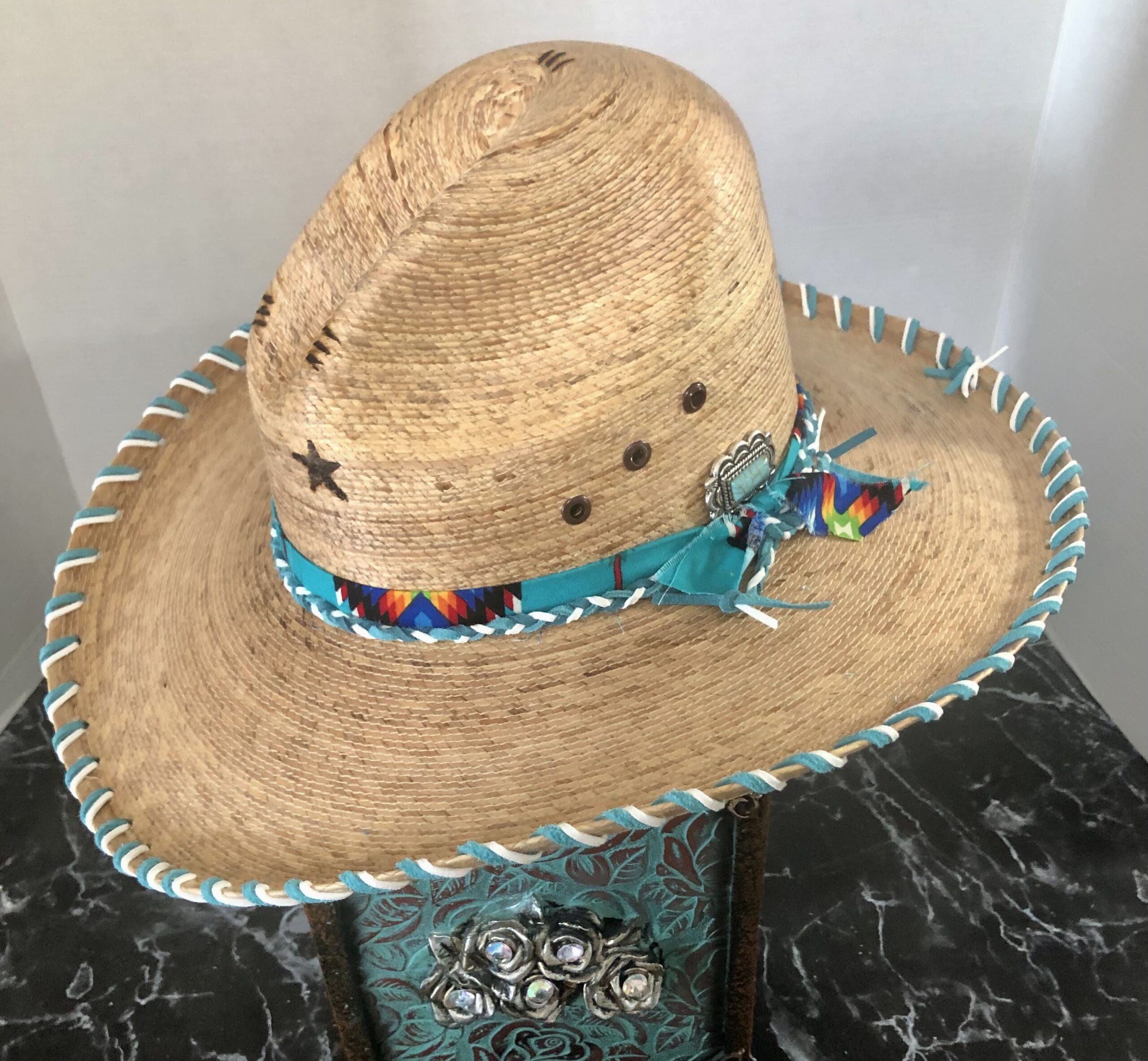 It’s gently laced with beautiful turquoise and white leather latigo.