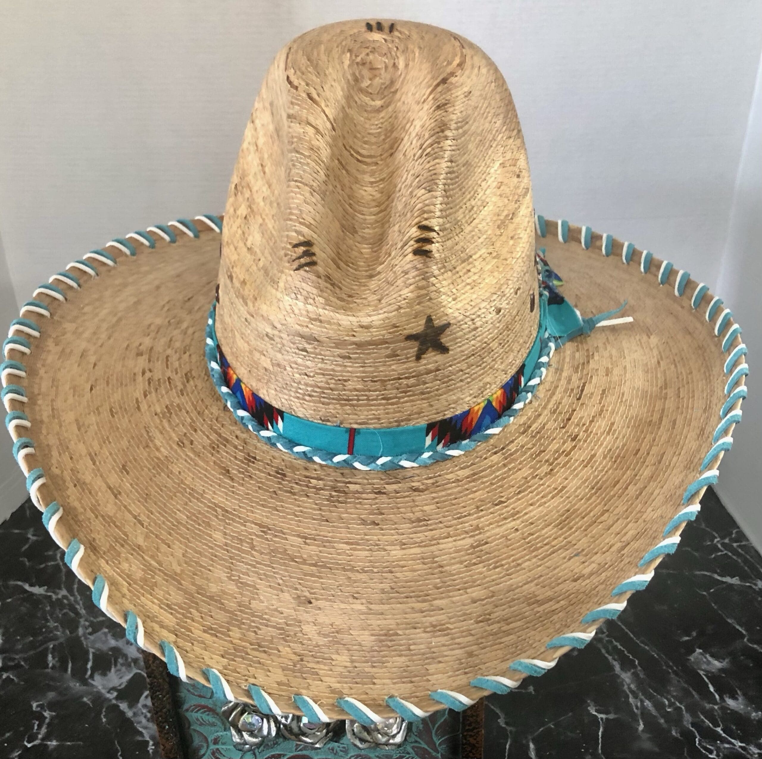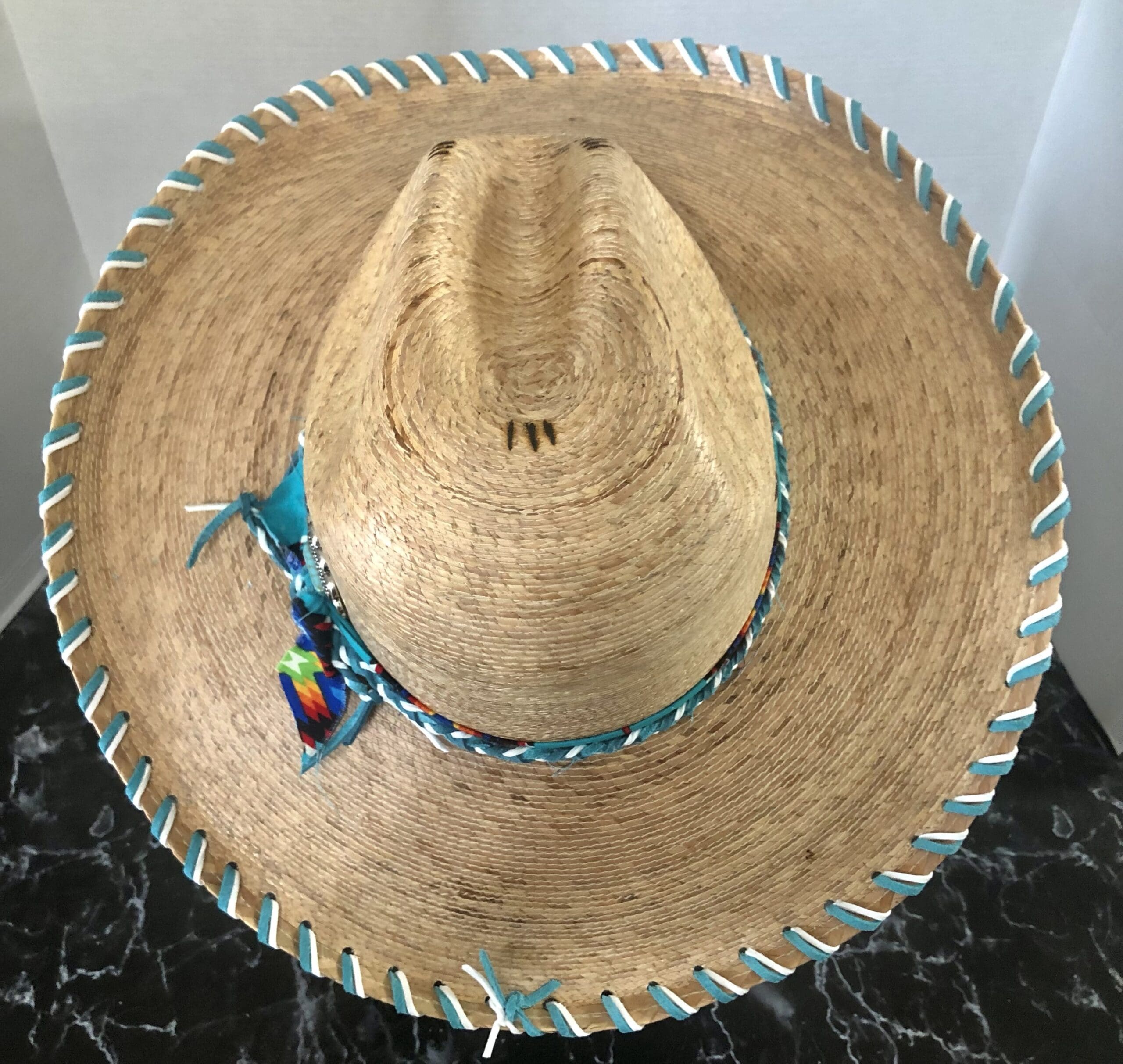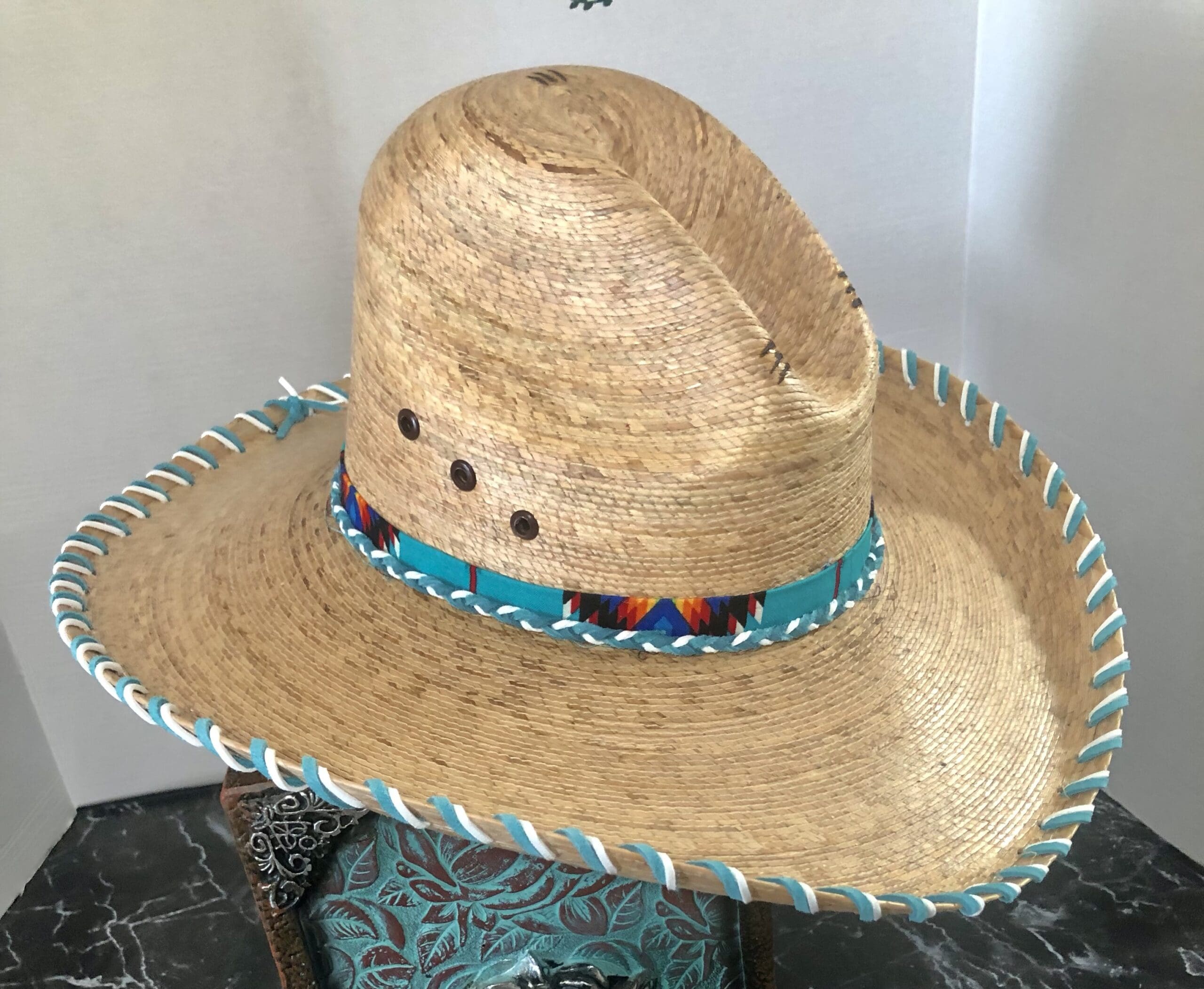 The hatband is made up of bright Navajo material and braided leather latigo in matching colors to the lacing and hatband.