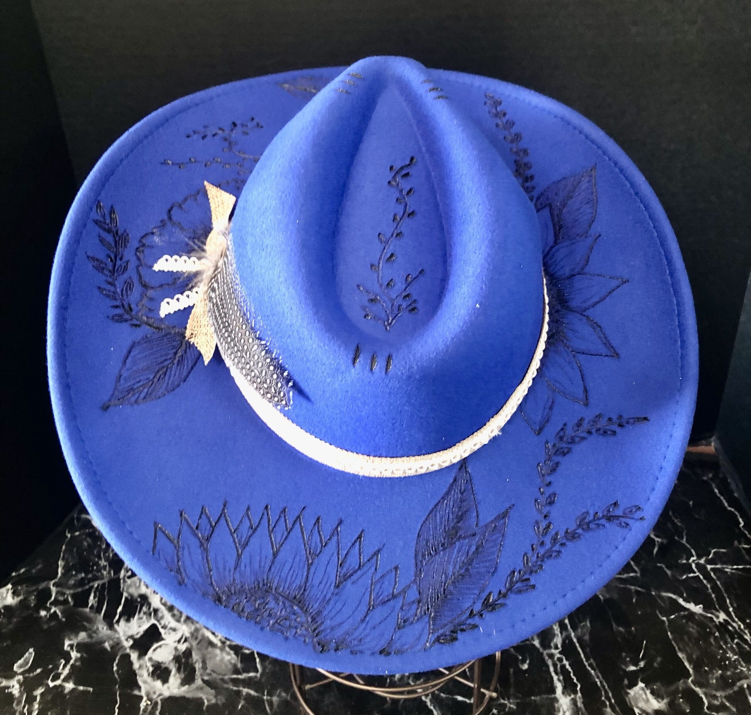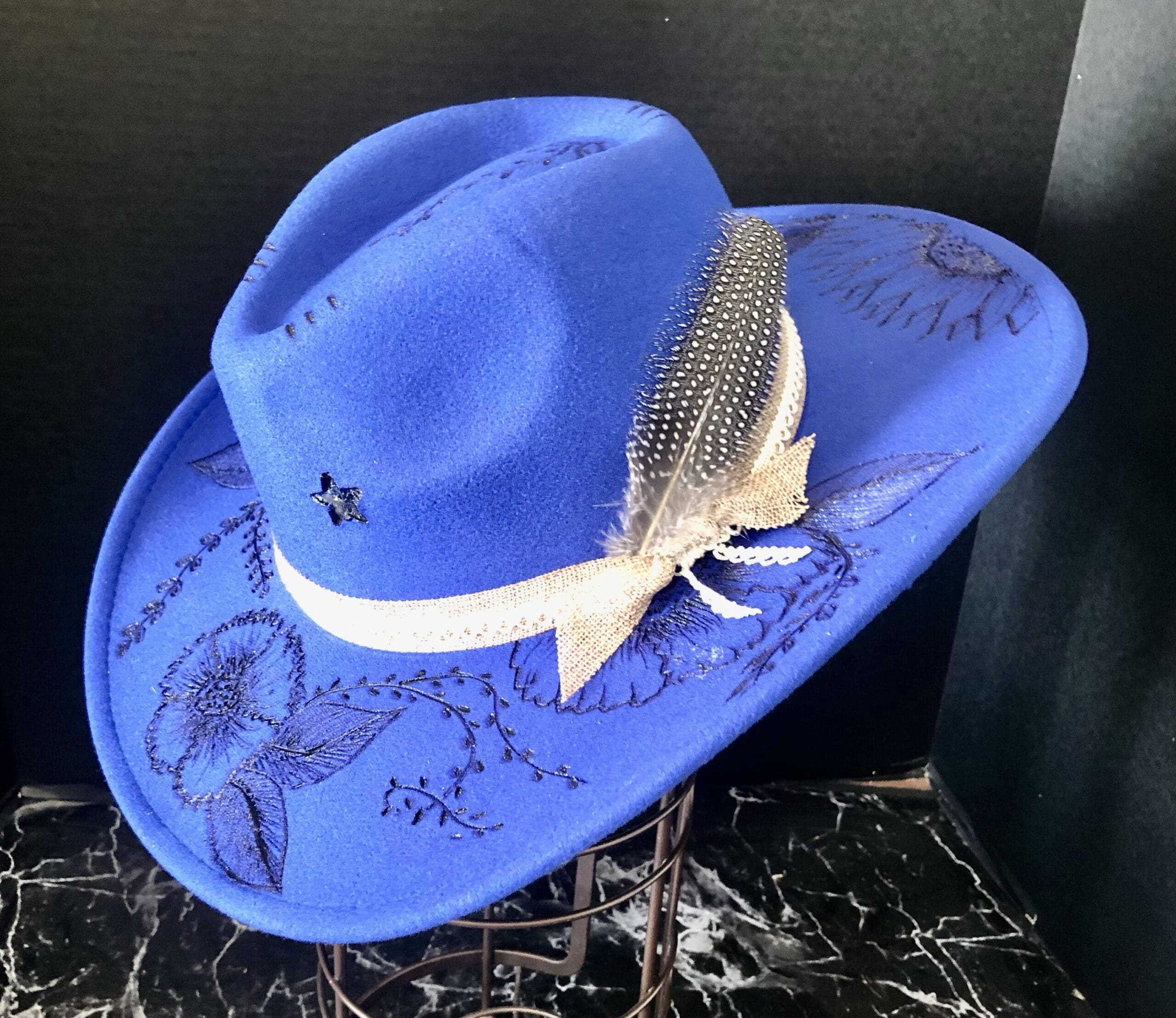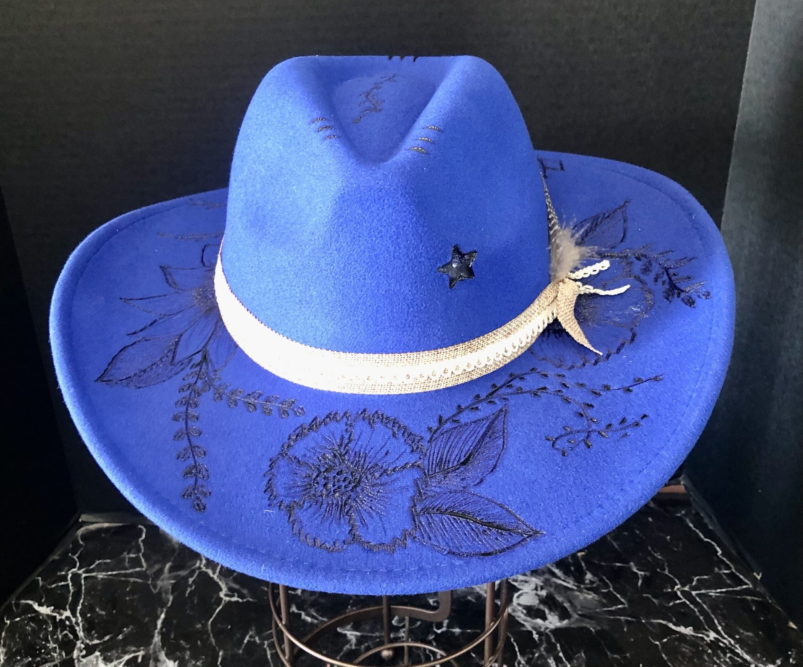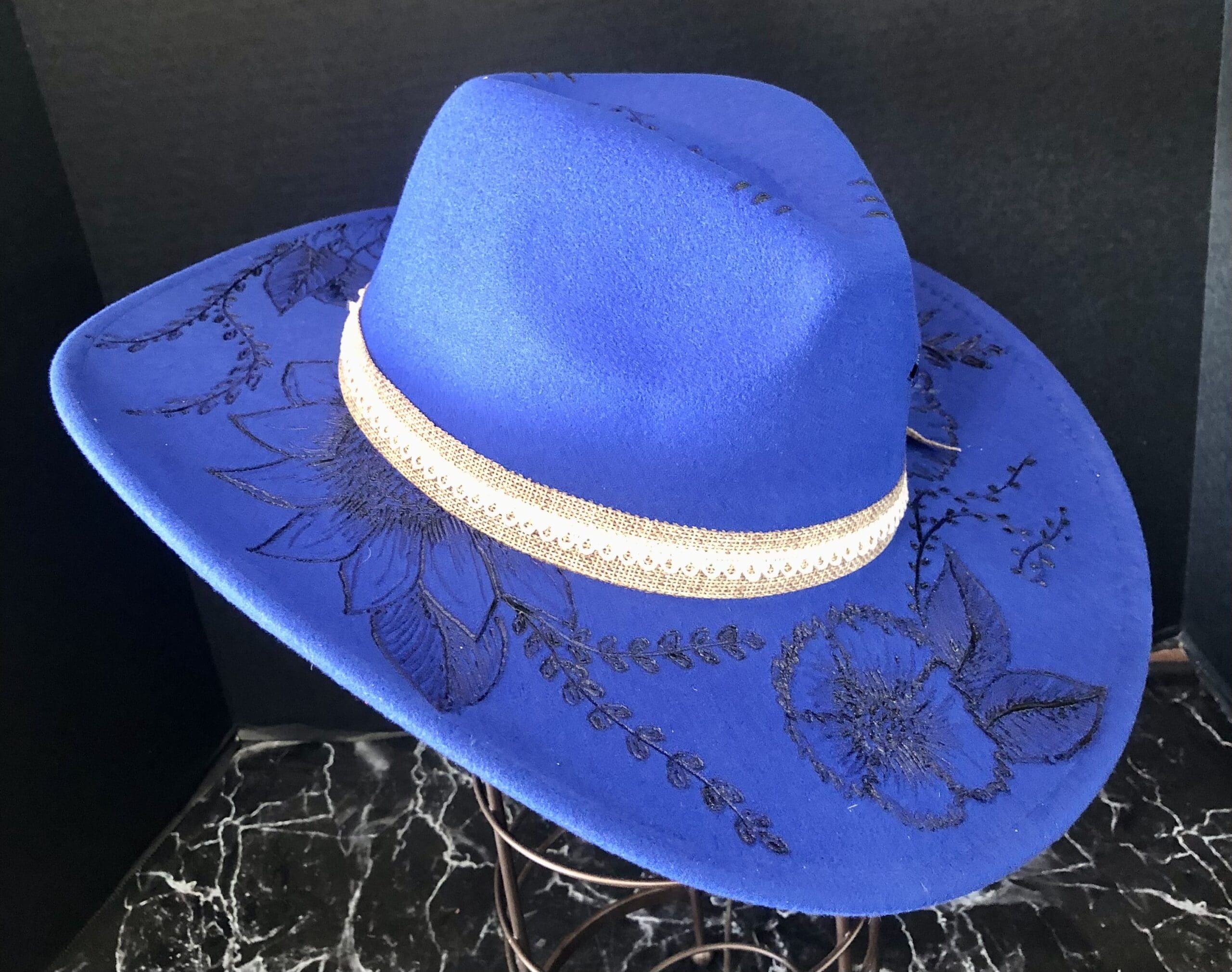 The Bluebell is a royal blue felt sporting a new design crease. A variation of a relaxed Laney Wilson crease. The beautiful floral design burnt across the brim is great for the upcoming spring season.Burlap and lace makeup the hatband to inspire a delicate style.