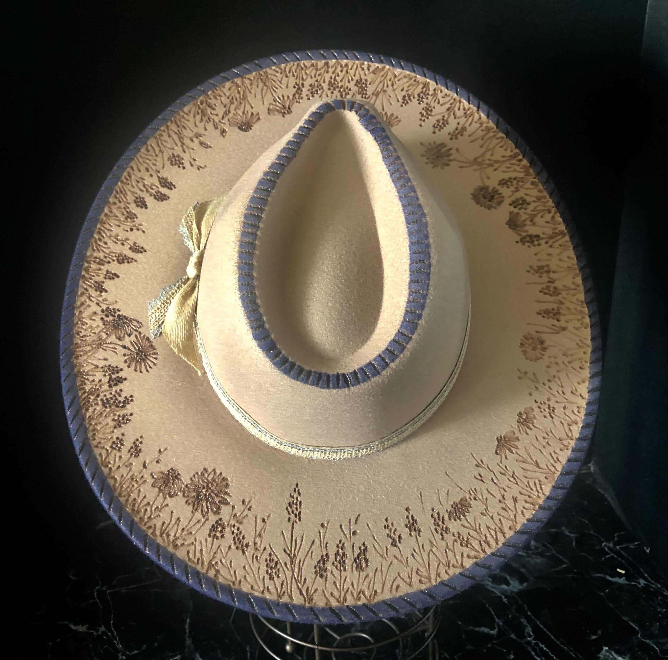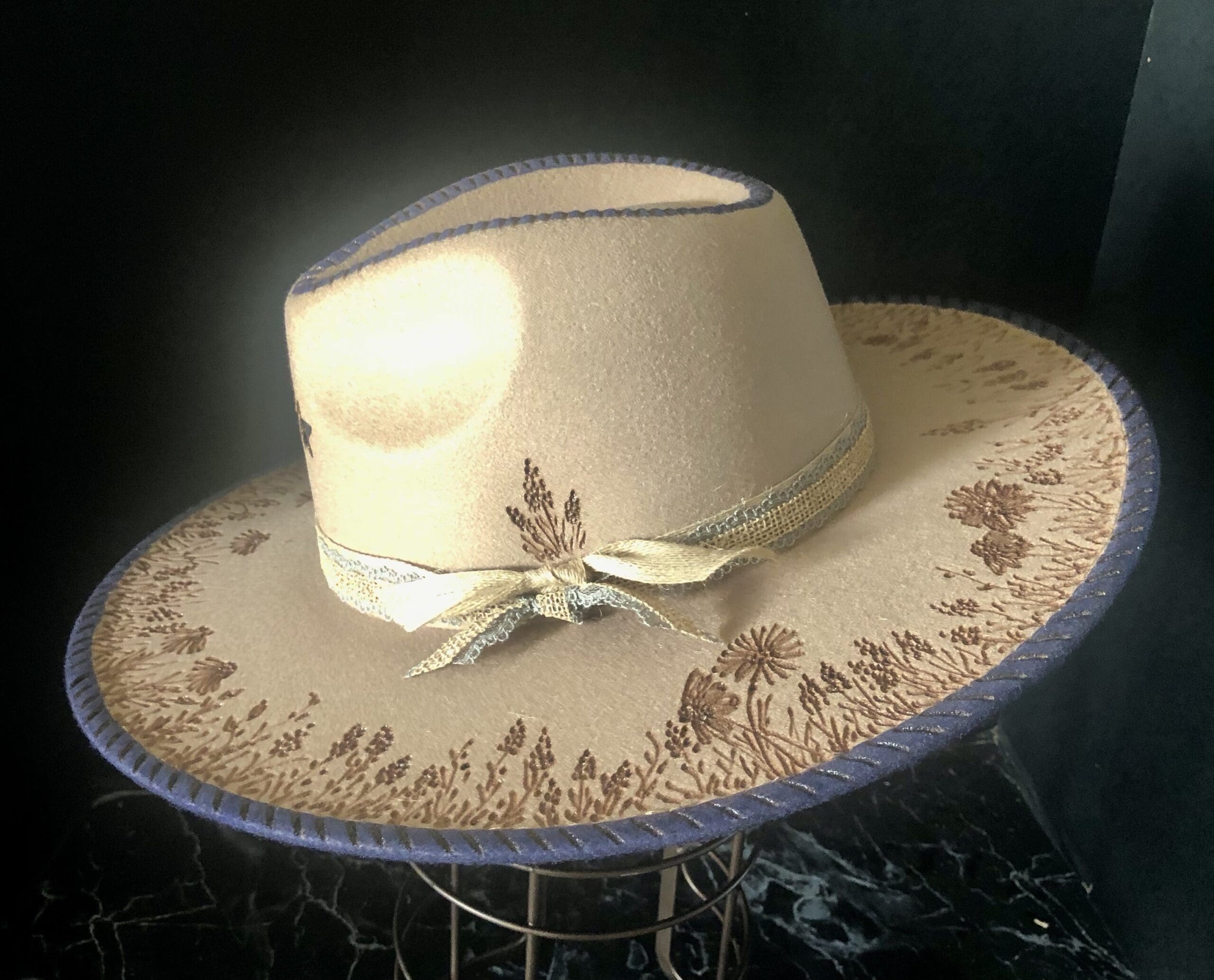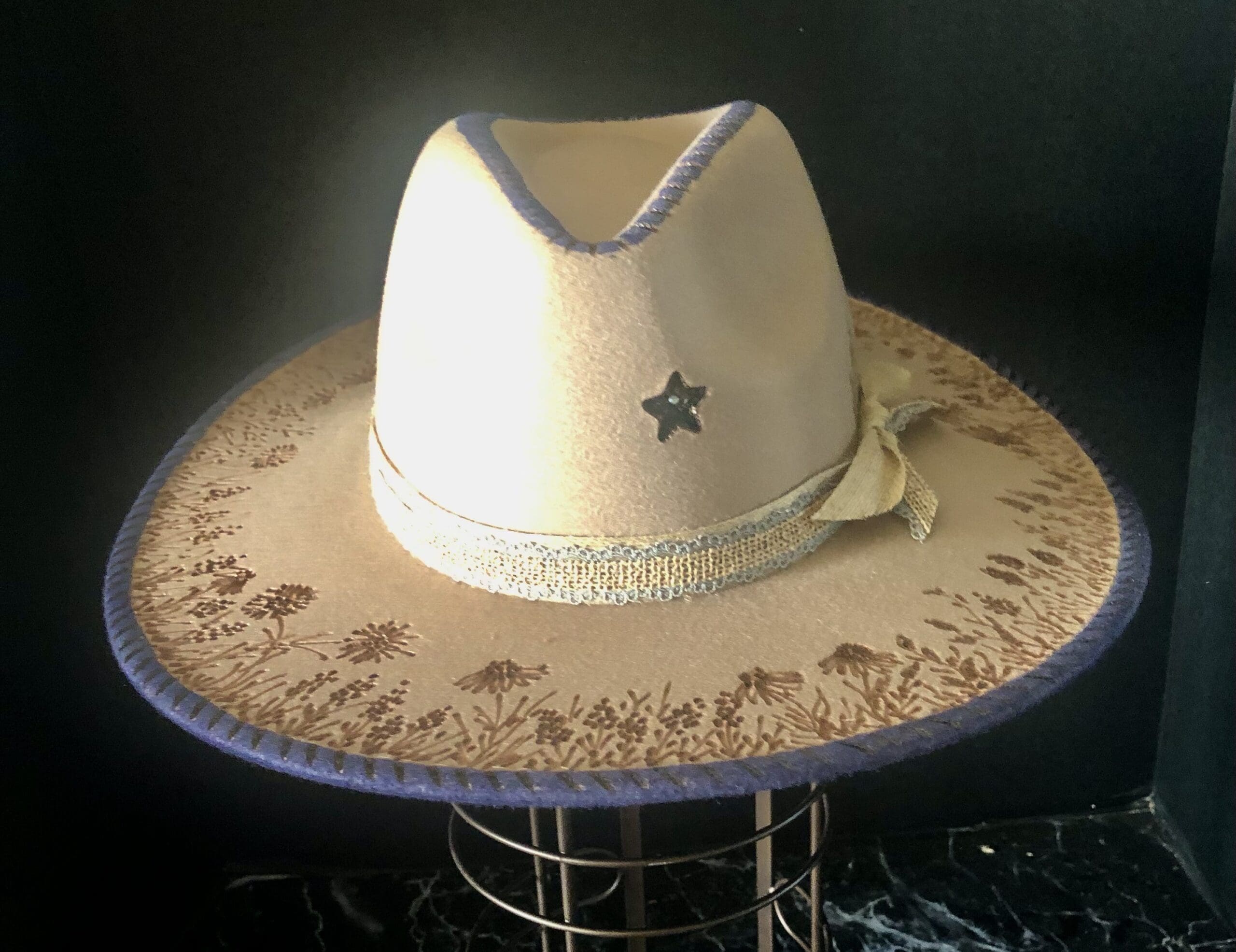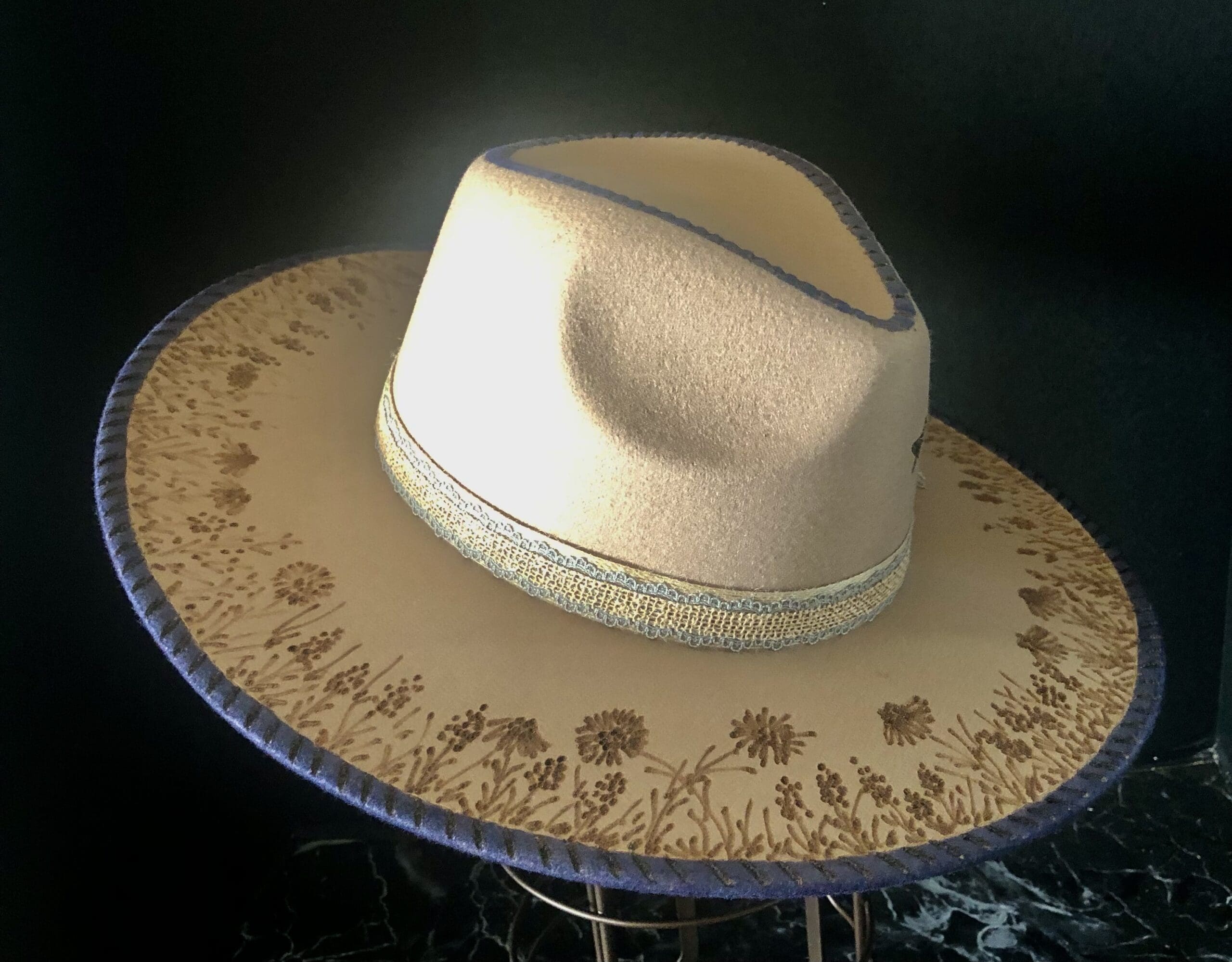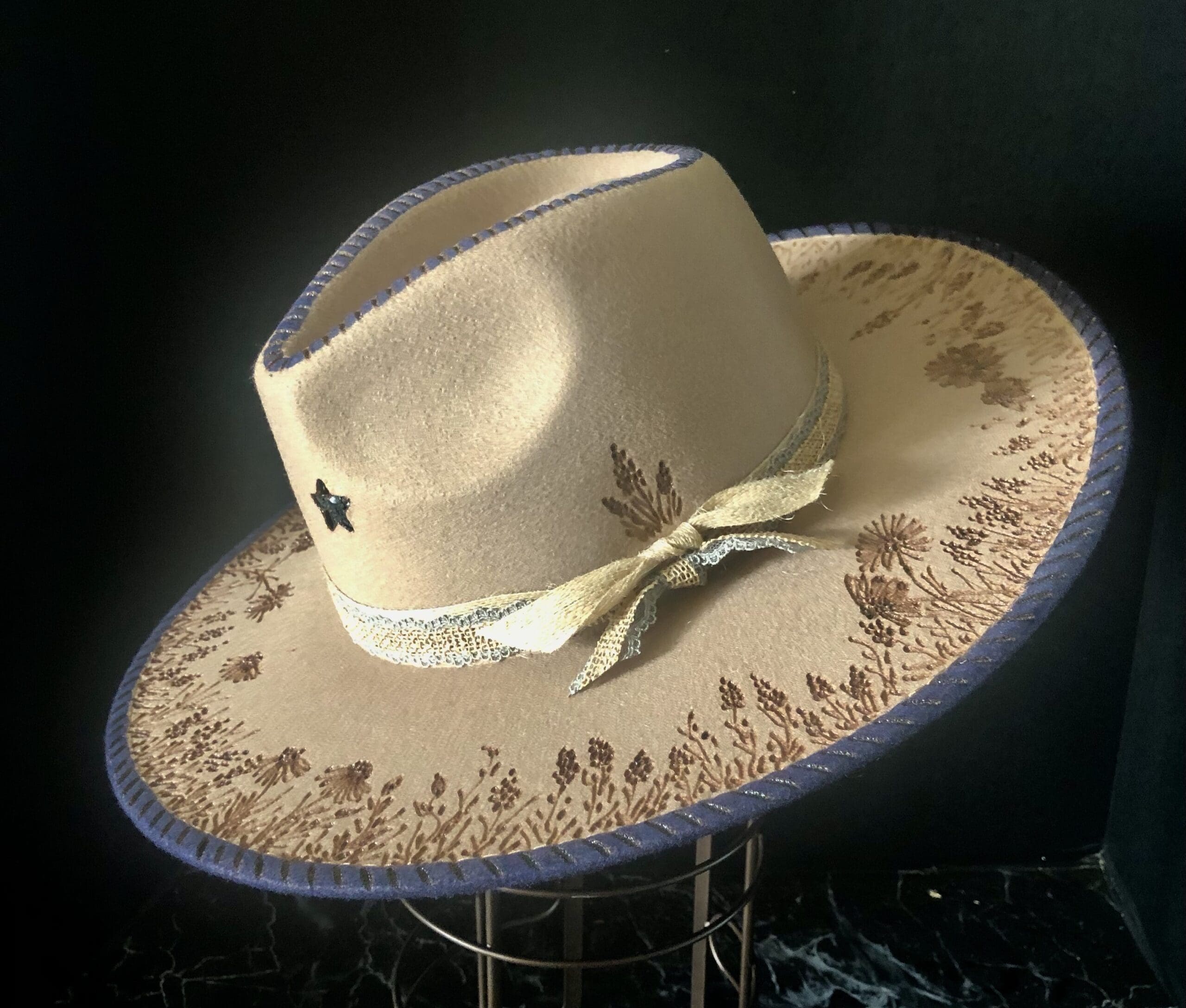 The Bluebonnet is a taupe felt with a minimal wildflower design burnt across the brim. The navy color across the crown and rim of the hat makes it stand out and unique. A small bluebonnet cluster on the tie side finishes it off as a classic look.