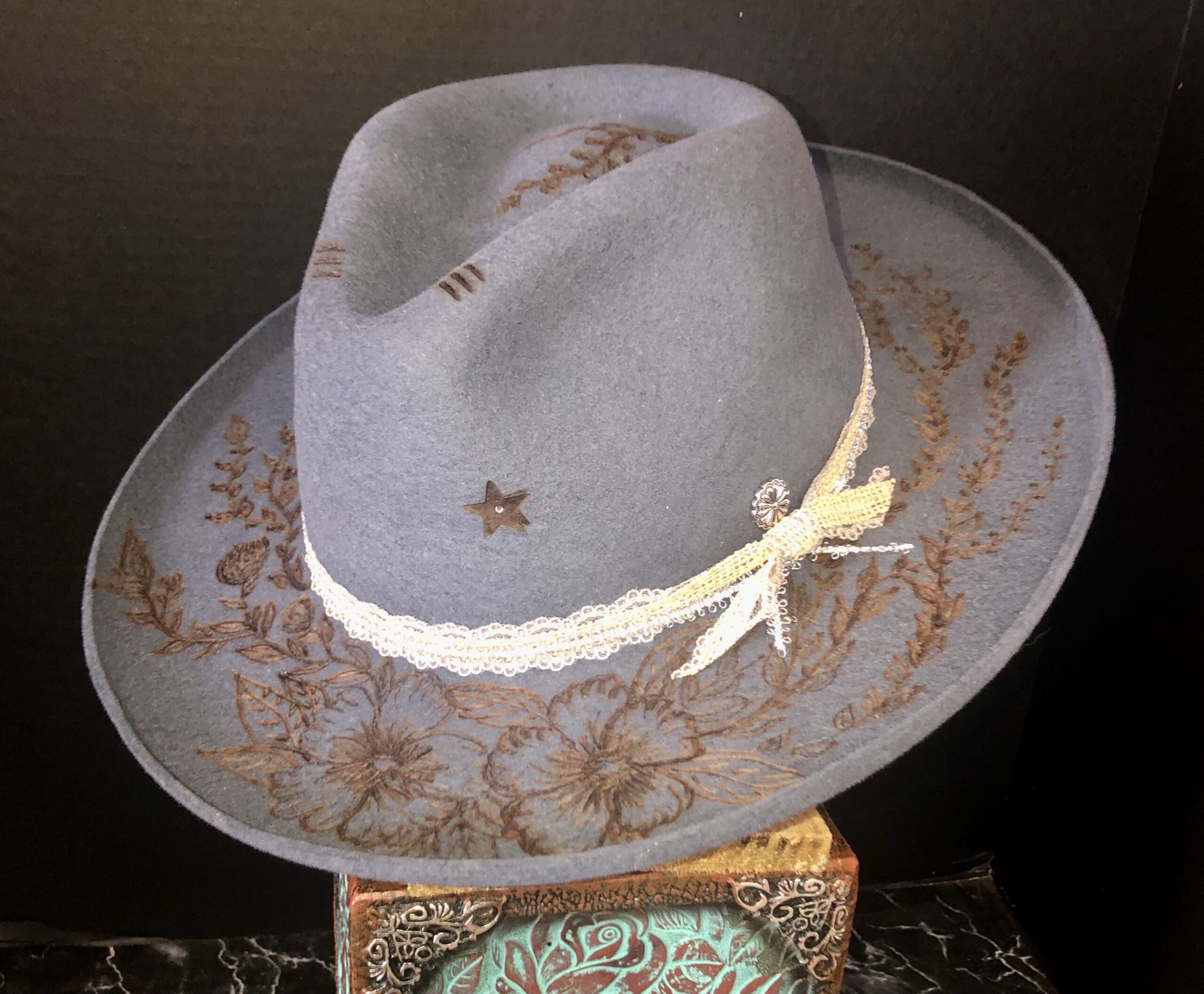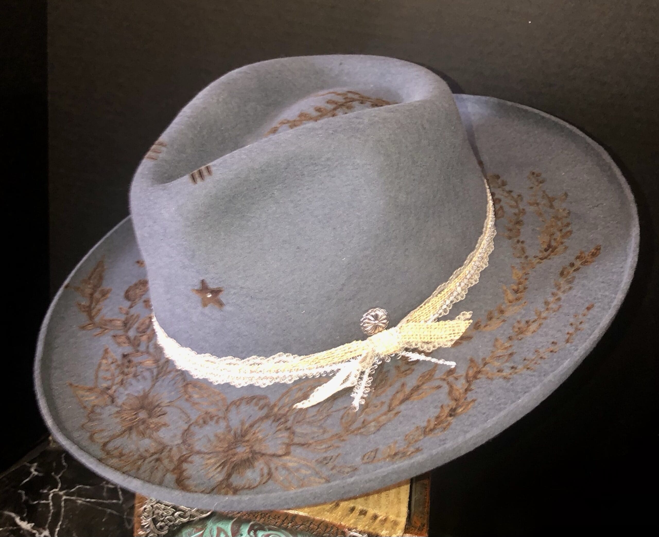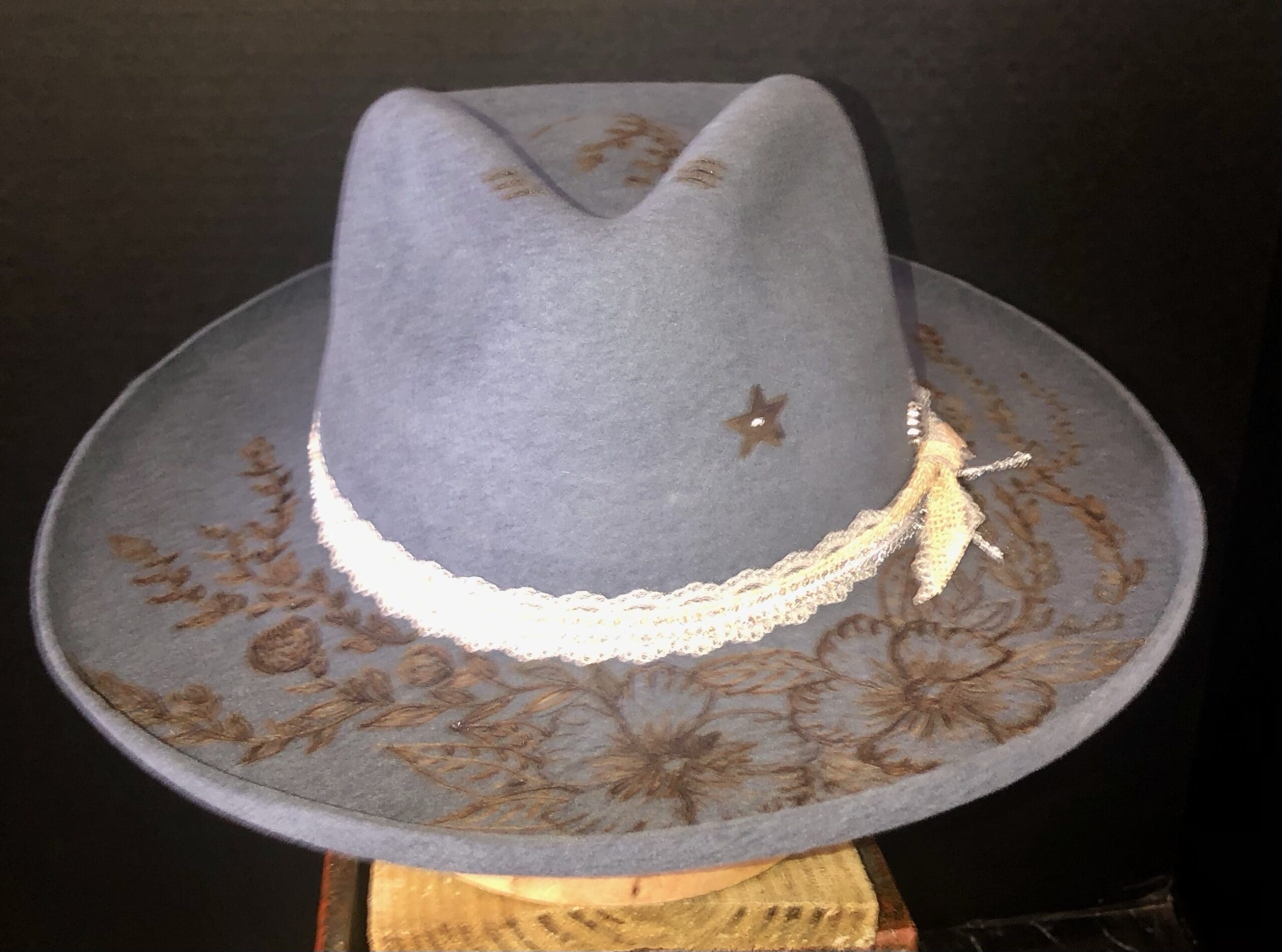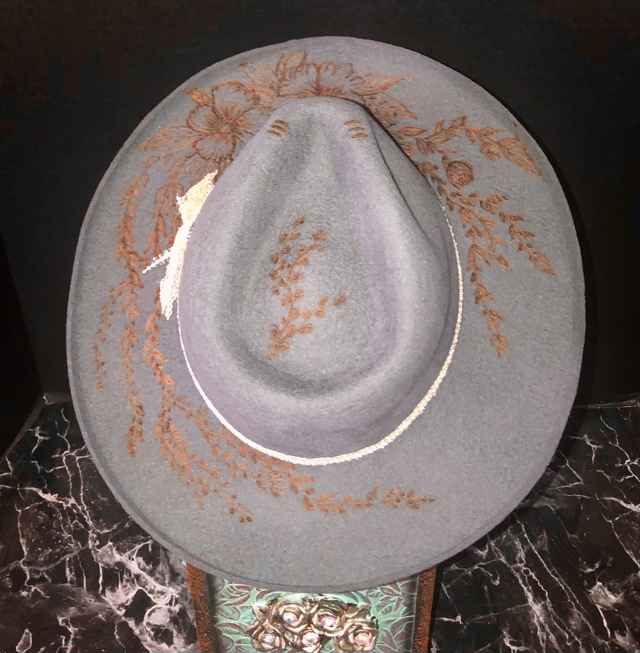 The pencil roll brim is a smaller brim that’s finished off with burnt crawling vines and pansies that complement the crown also. It’s a delicate design that’s makes it one of a kind as all our hats are. There will never be two of a kind in any design.