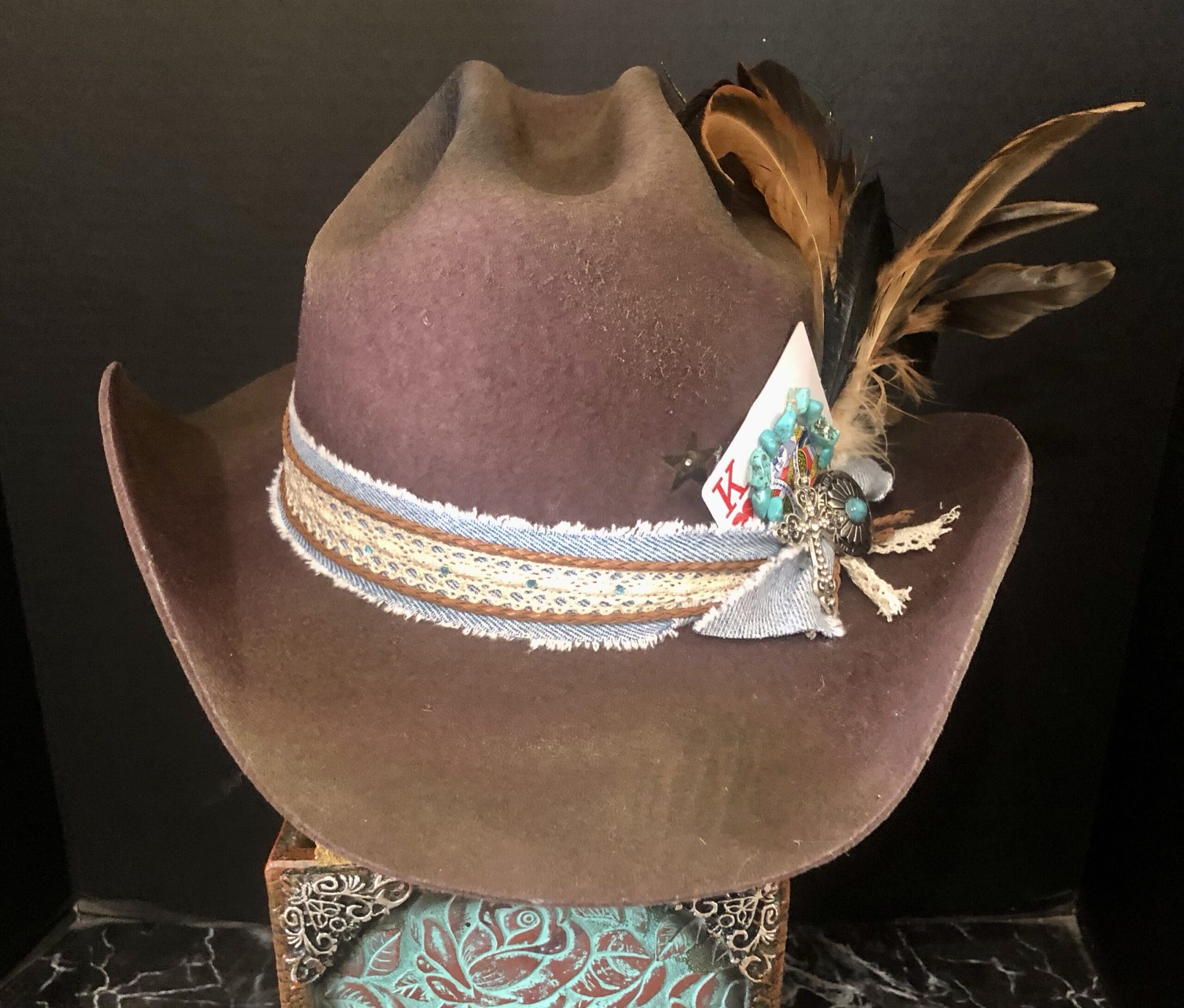 The Montana is a deep chocolate brown is blinged out with turquoise, swarski crystals, faded denim, and lace. Tied with braided bolo leather and topped off with a silver concho, crystal cross, and a turquoise loaded King playing card.