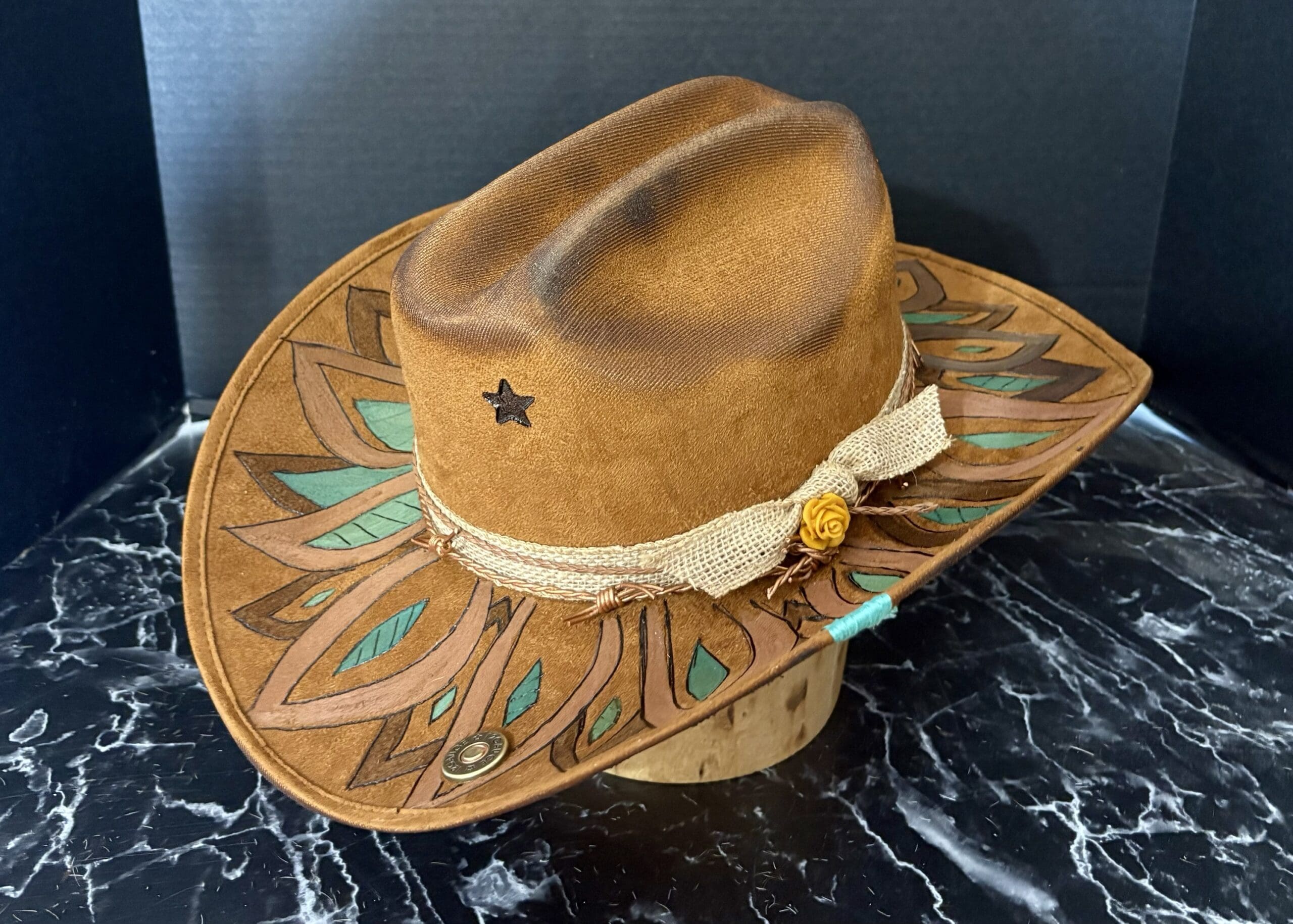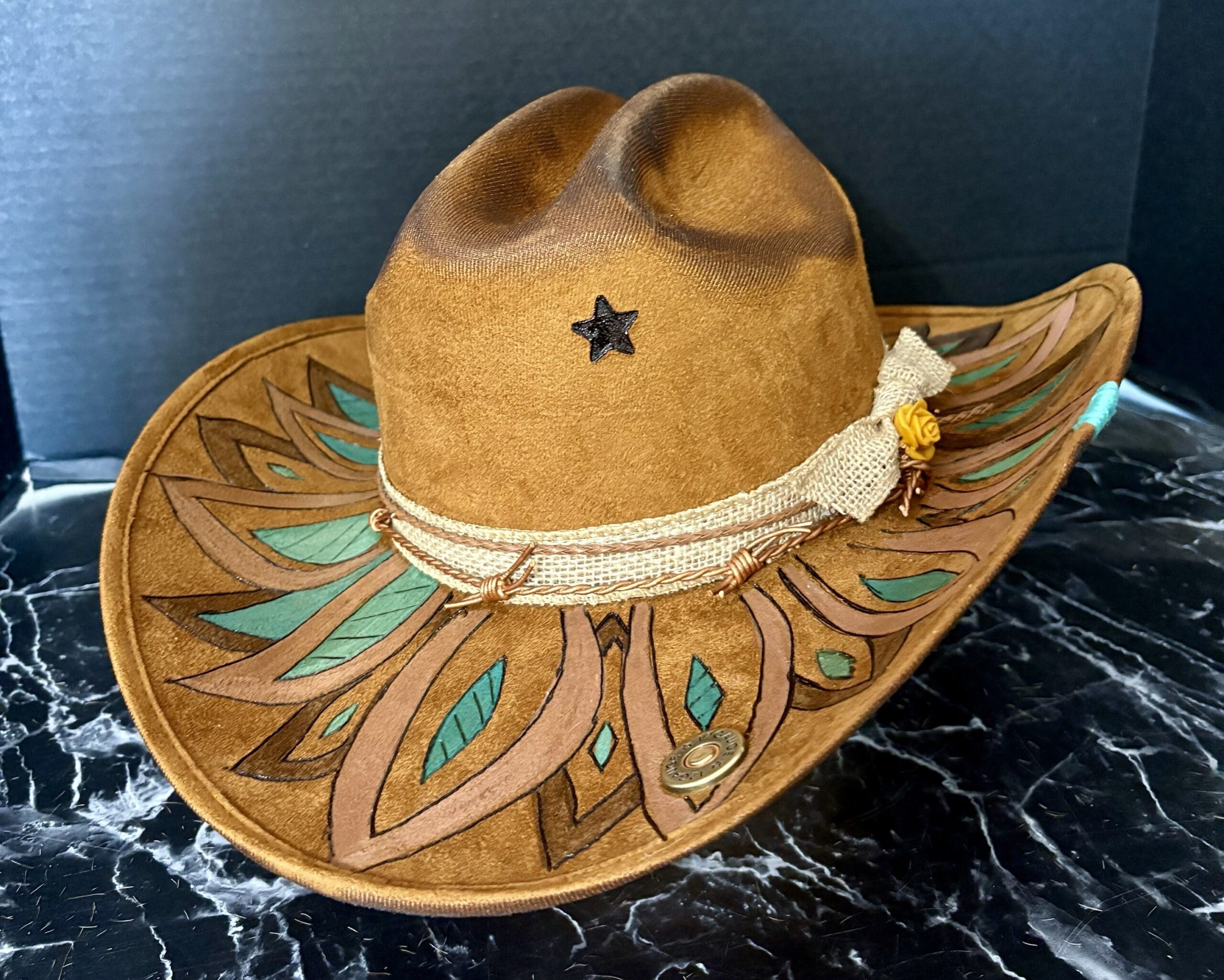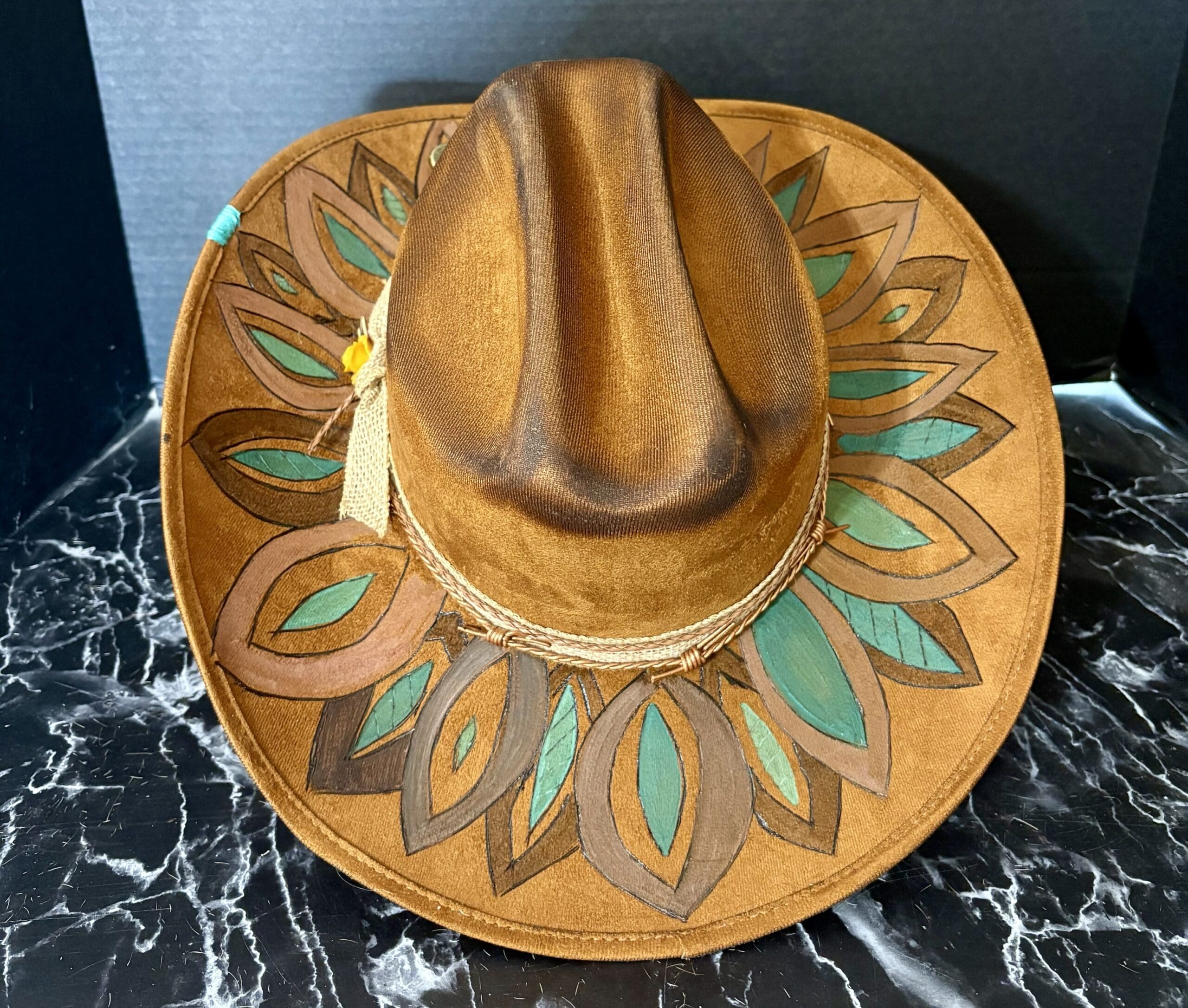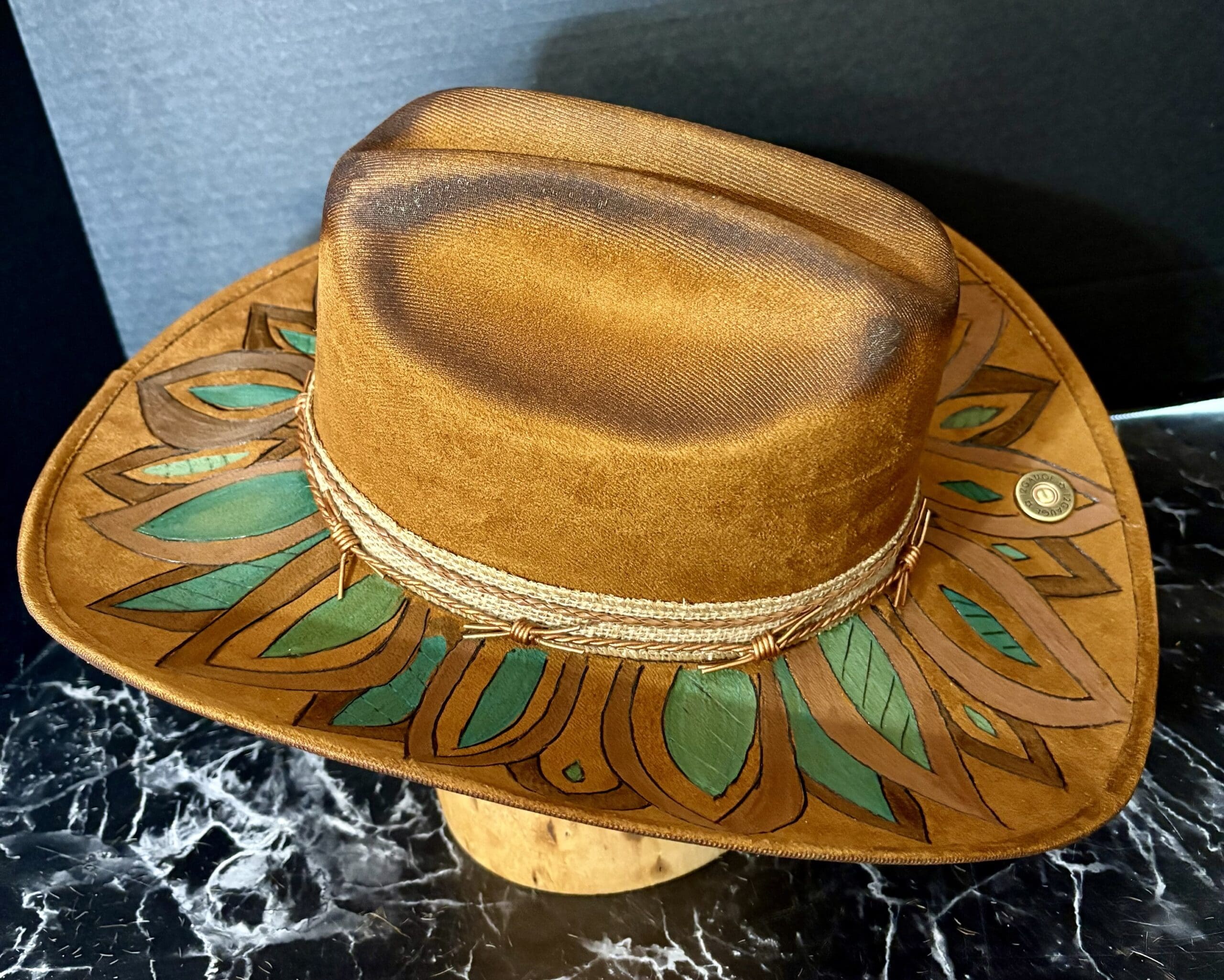 It’s burnt with feathers and teal touches to highlight the seasonal beauty. It’s aged and tied off on the brim with teal leather ties.