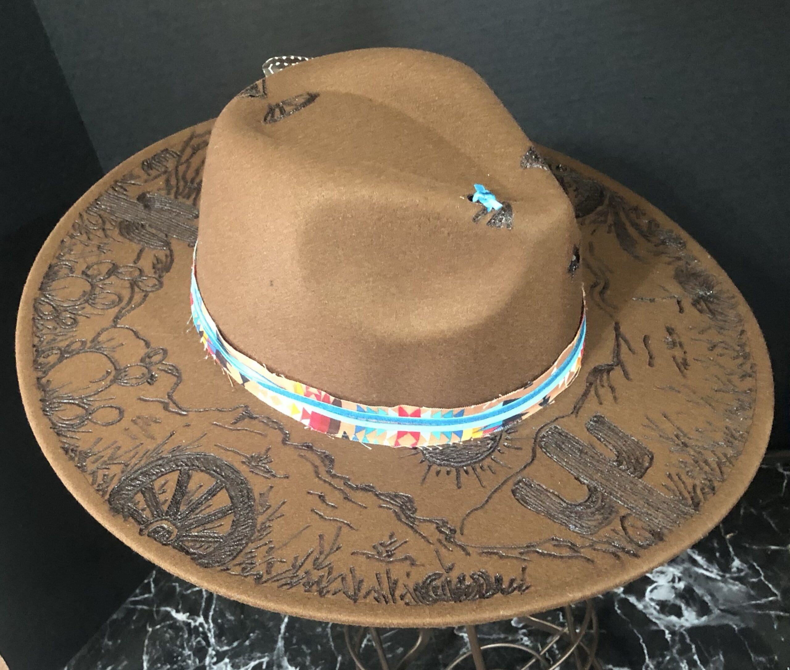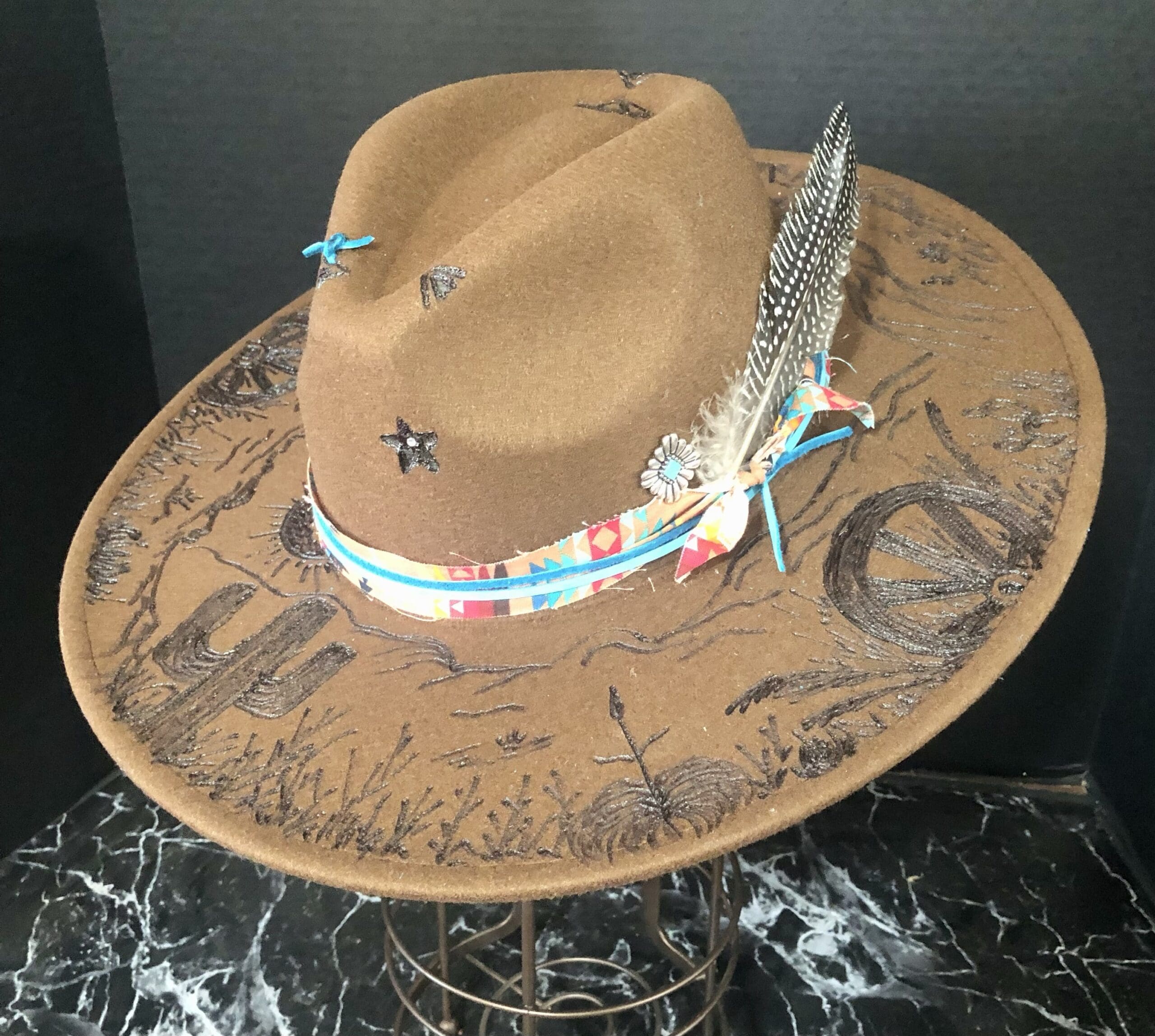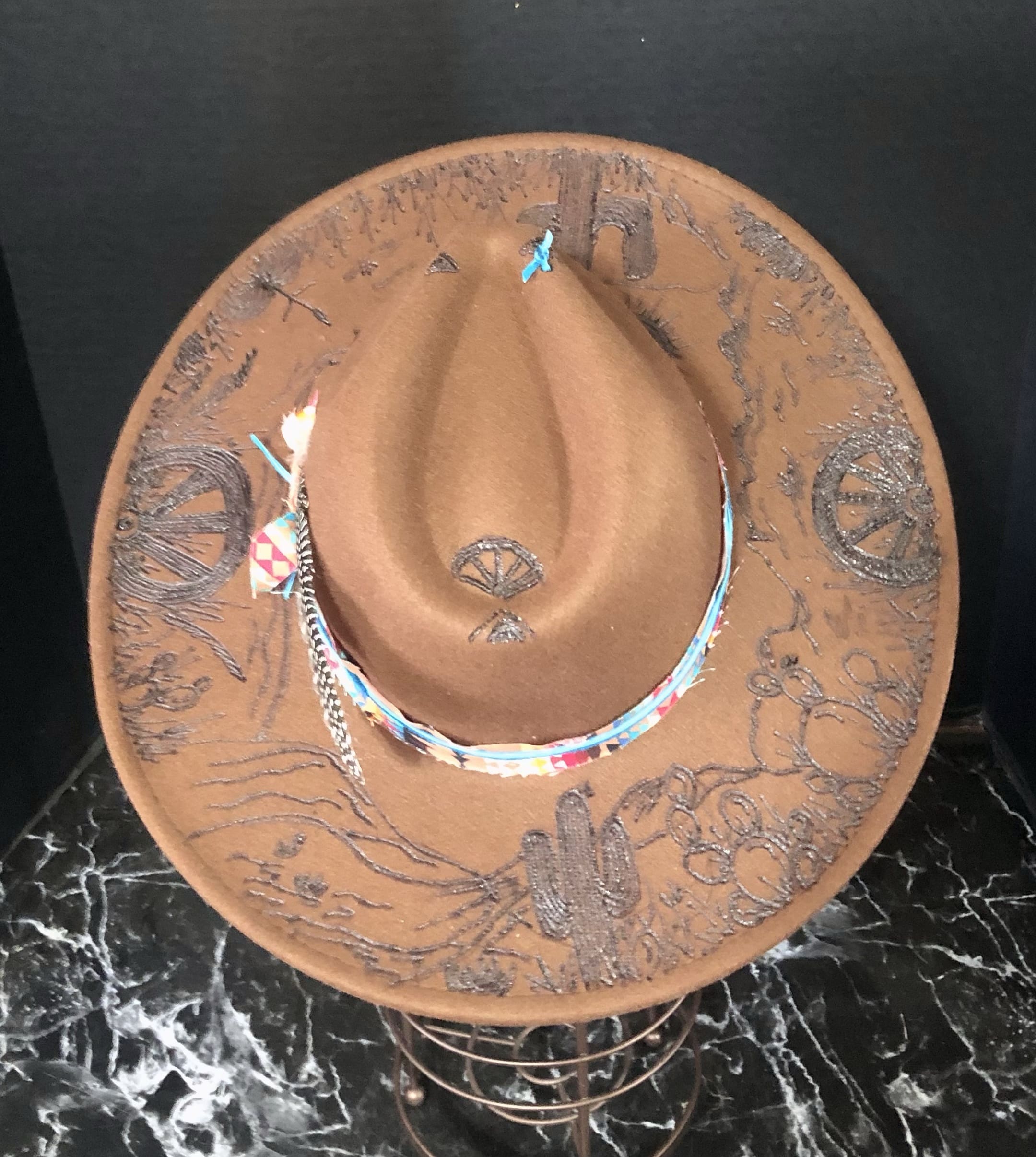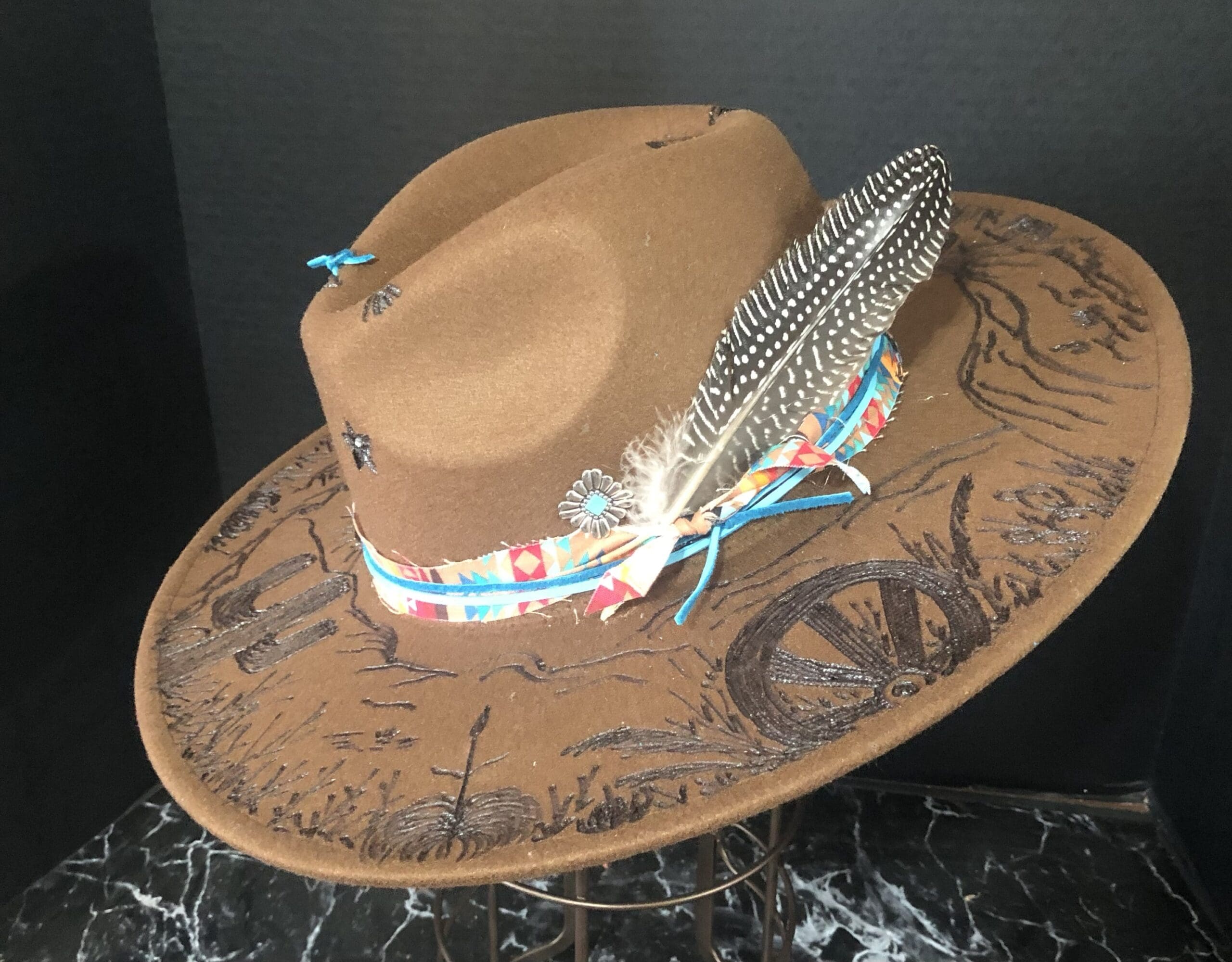 The Tulsa is a bit of rustic on a rustic brown felt hat. It’s burnt with cactus, wagon wheels, sequoias, and grasses. The hatband is a colorful mixture of Navajo colors tied with turquoise leather lacings. A silver and turquoise concho along with a full Guinea feather finishes the unique look.