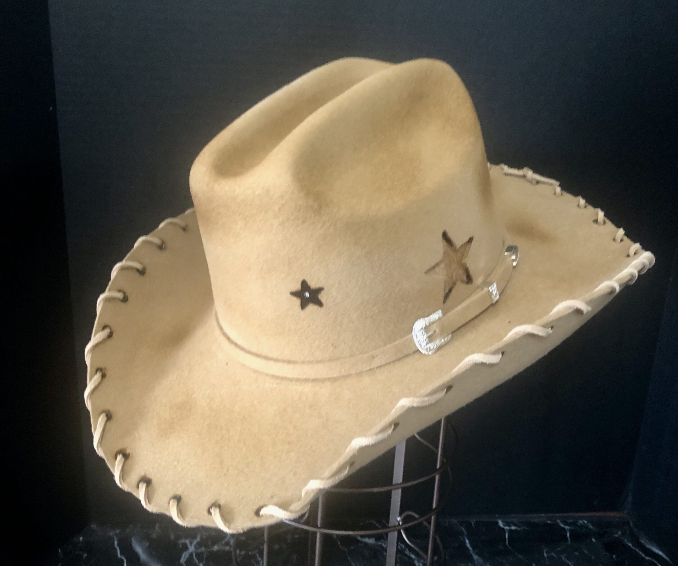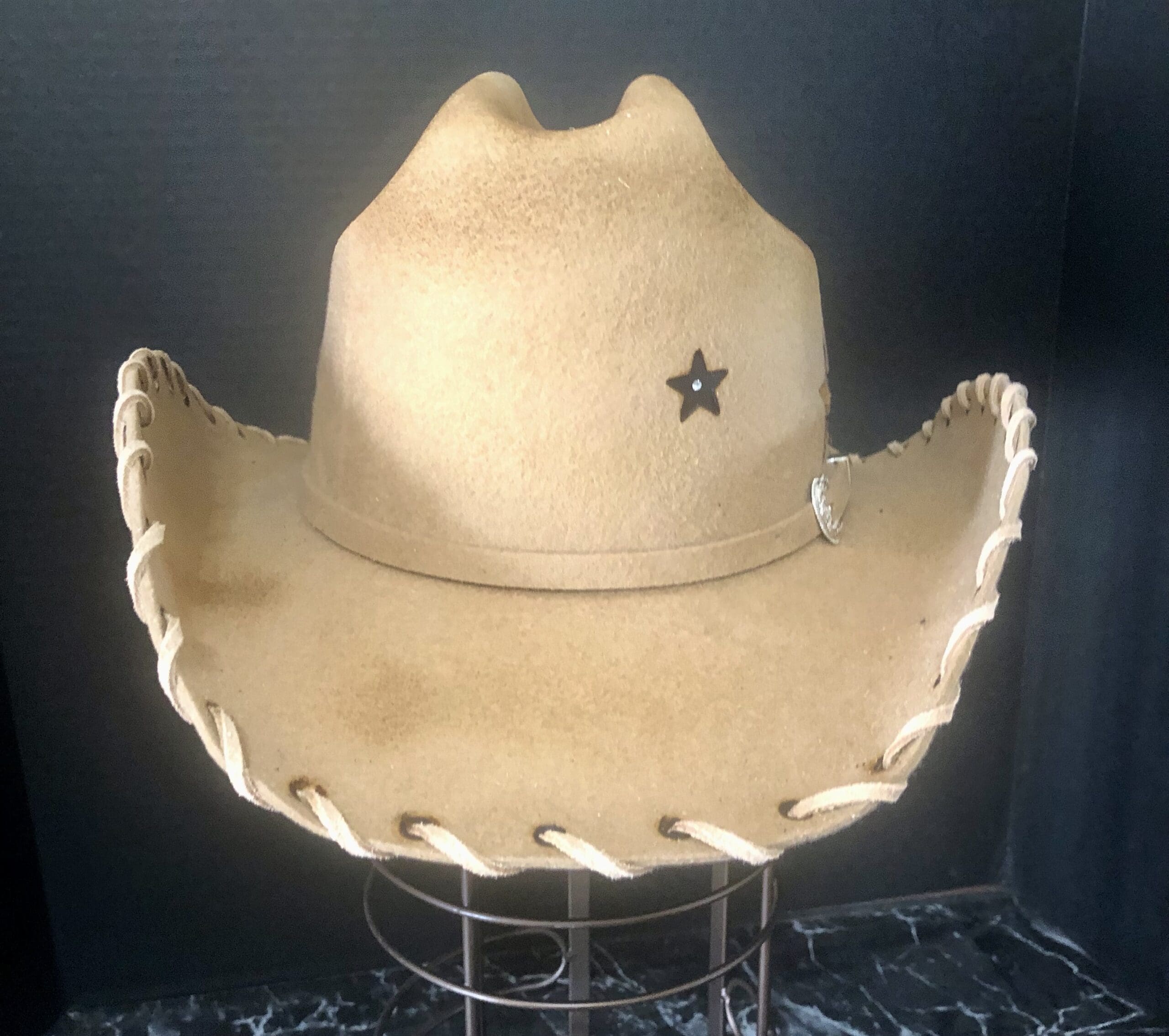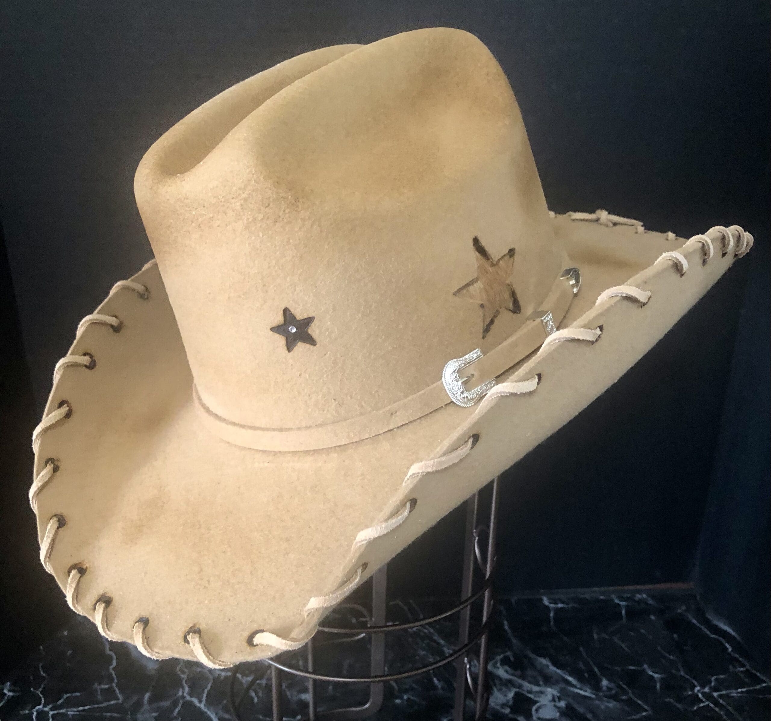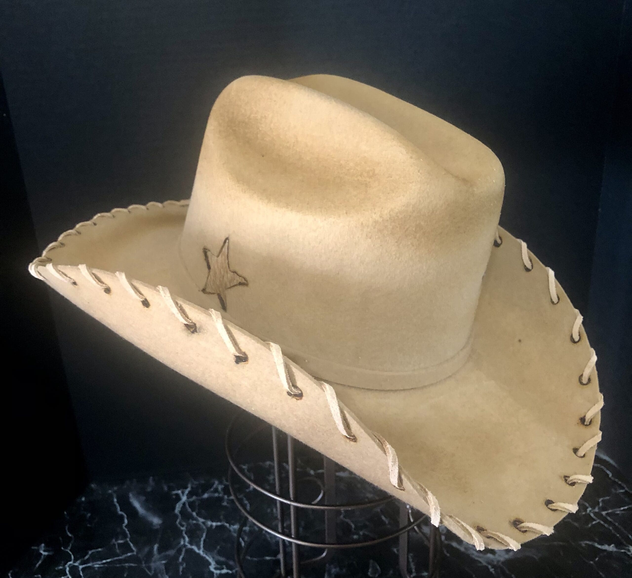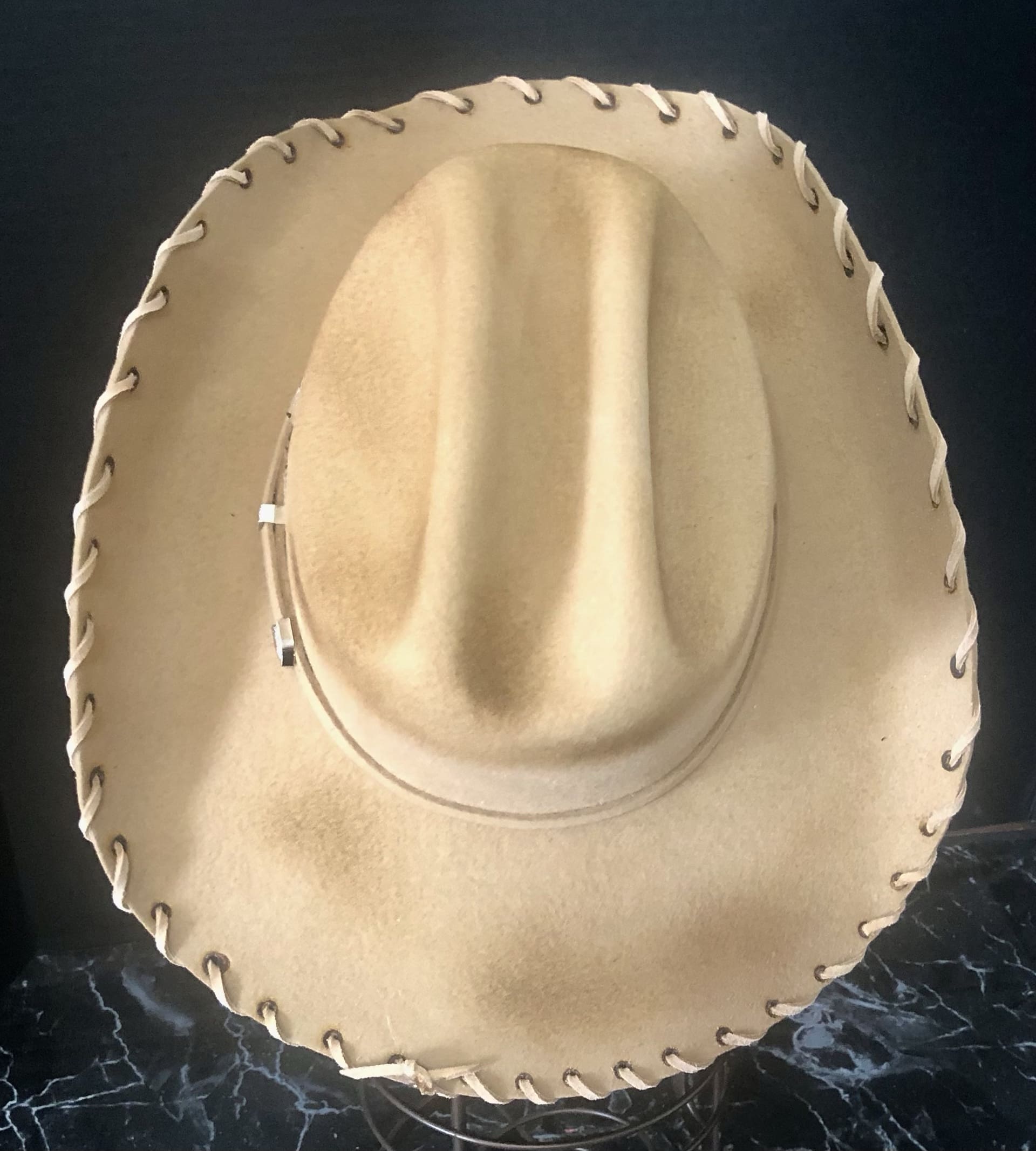 The Woodrow is an aged tan felt that has its inspiration from my favorite hat I wear a lot that everyone wants to buy off my head. The hat I’m talking about has so much history I would never part with it. As it was my Granddad Edwards hat. When I wanted it shaped for me I took it to a very talented hat designer in Luckenbach Texas. He told me he wasn’t touching it, but he would teach me how to create the treasure I so proudly wear today. And so the hat was created. This man’s name was Rusty. He created all of Hondo’s Hats and many many more hats for western films. Not sure whatever became of this sweet incredible man, but because of him he lit a fire. So thank you Rusty for helping me learn my trait!