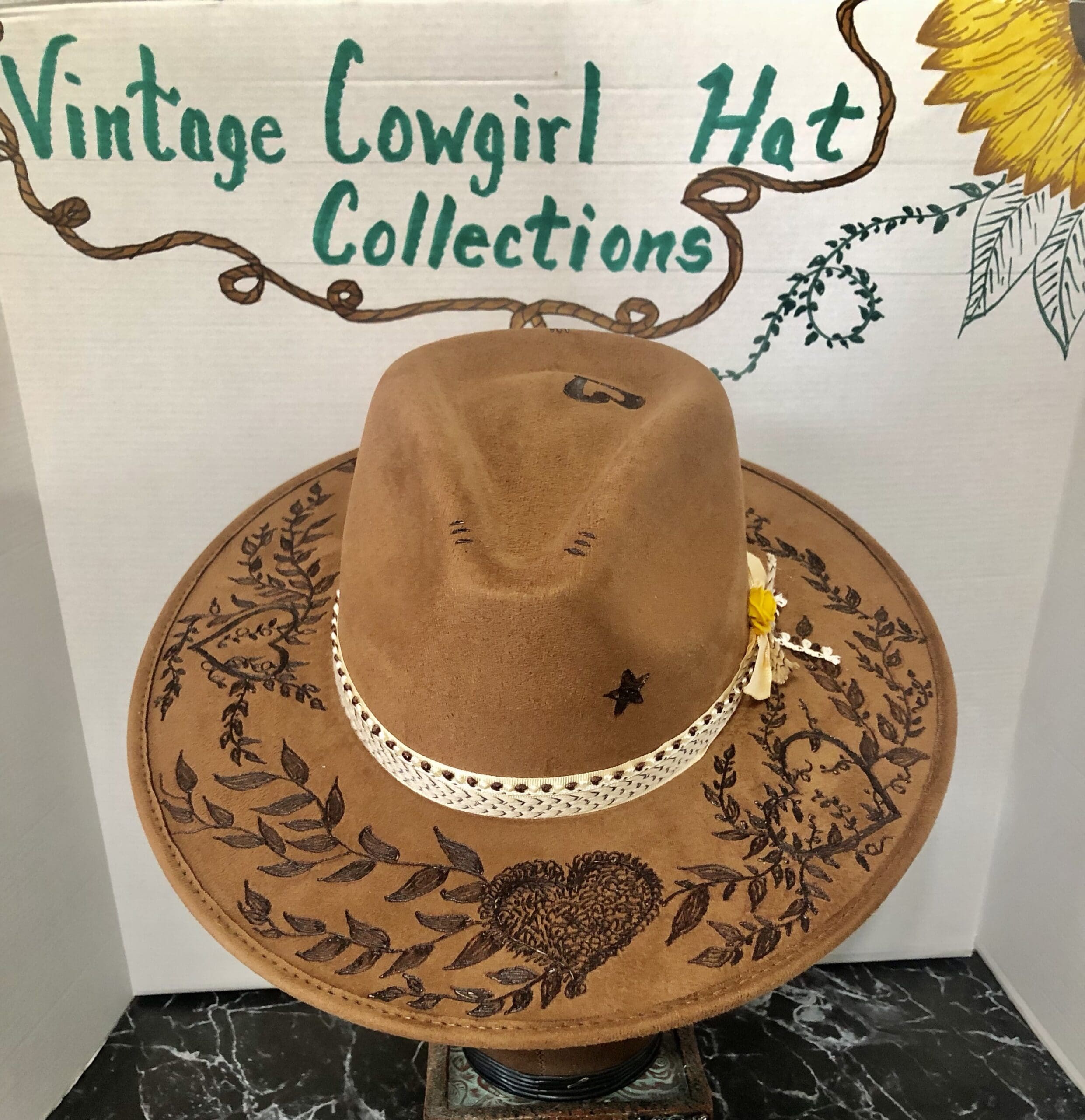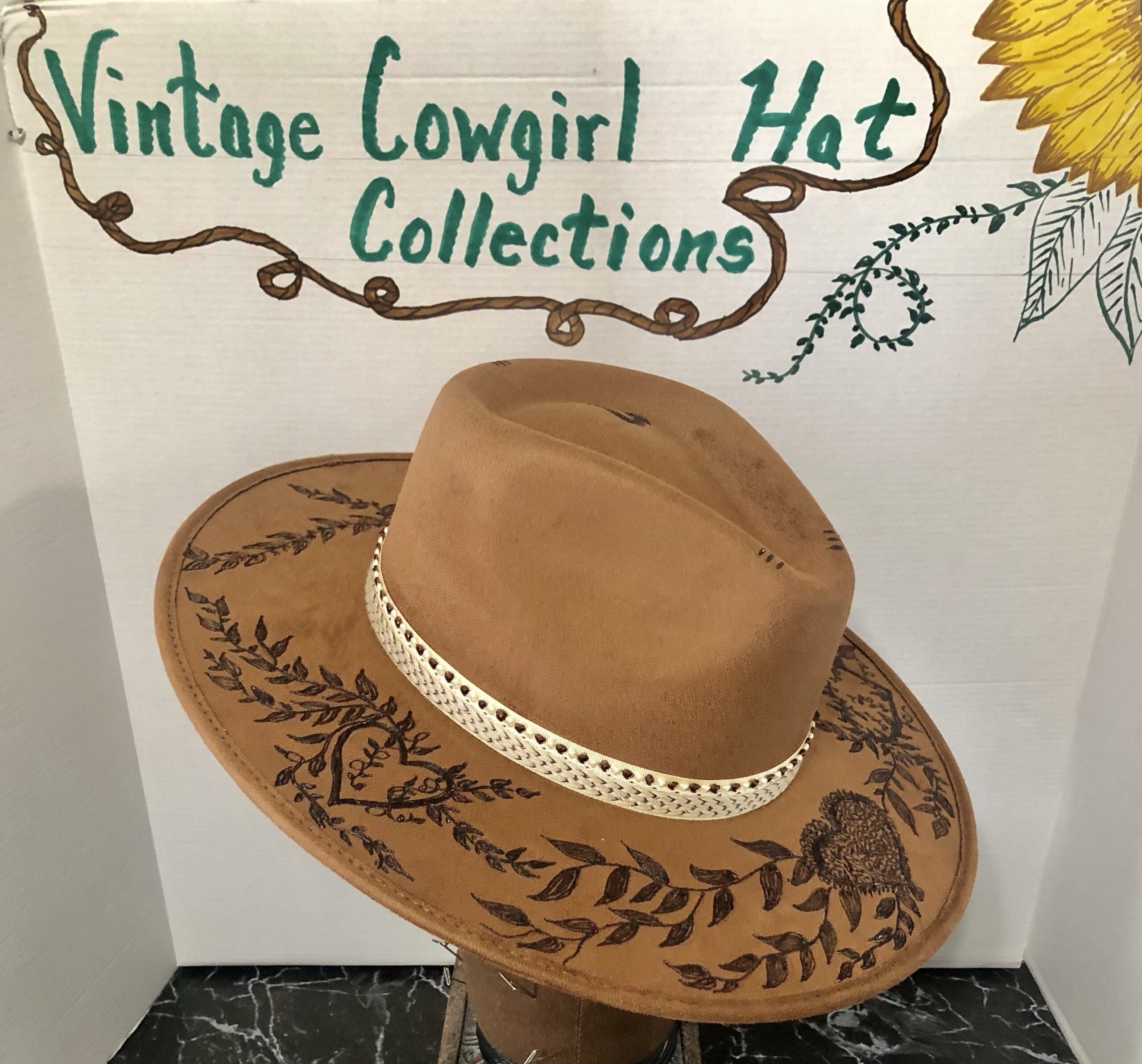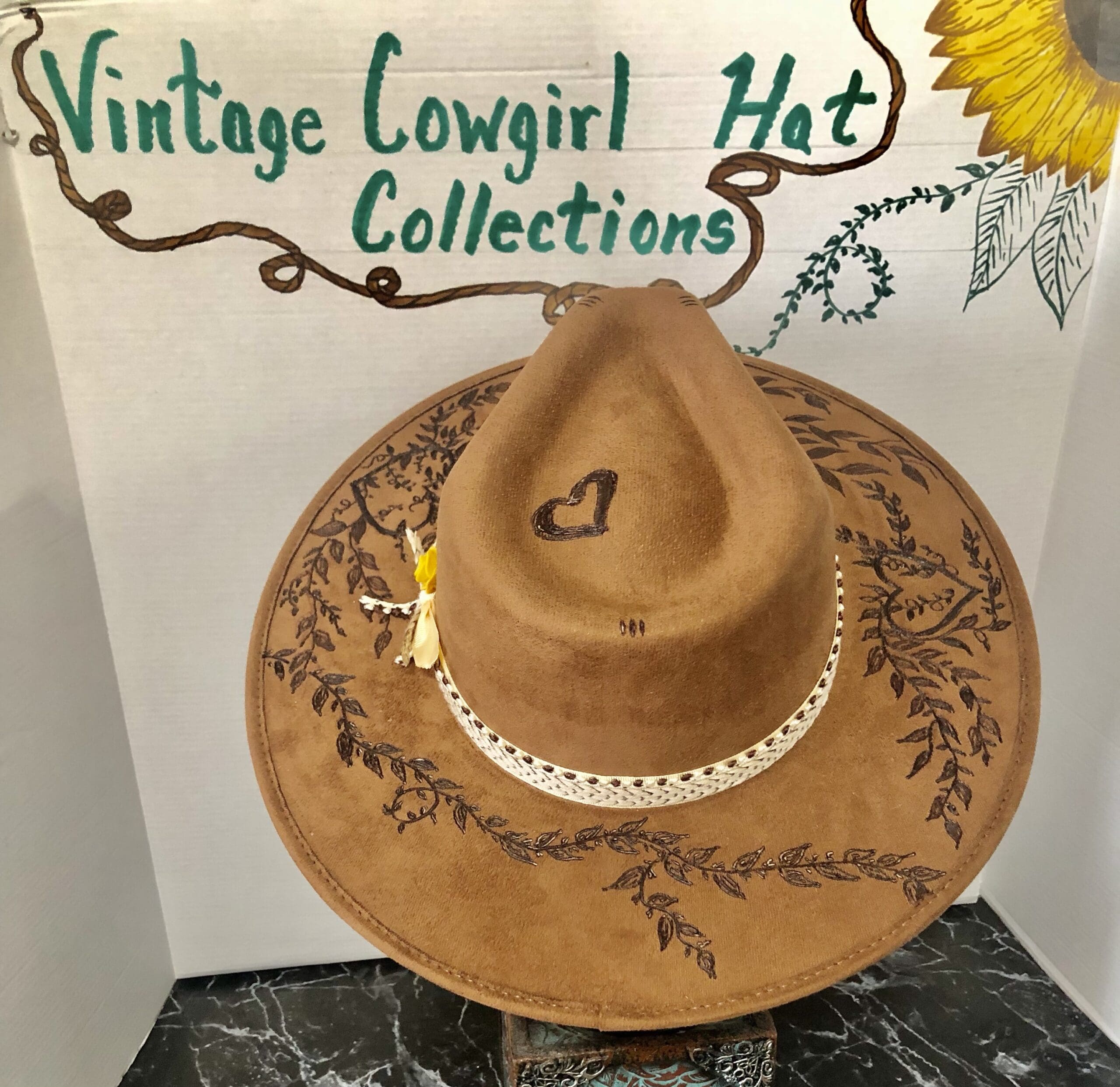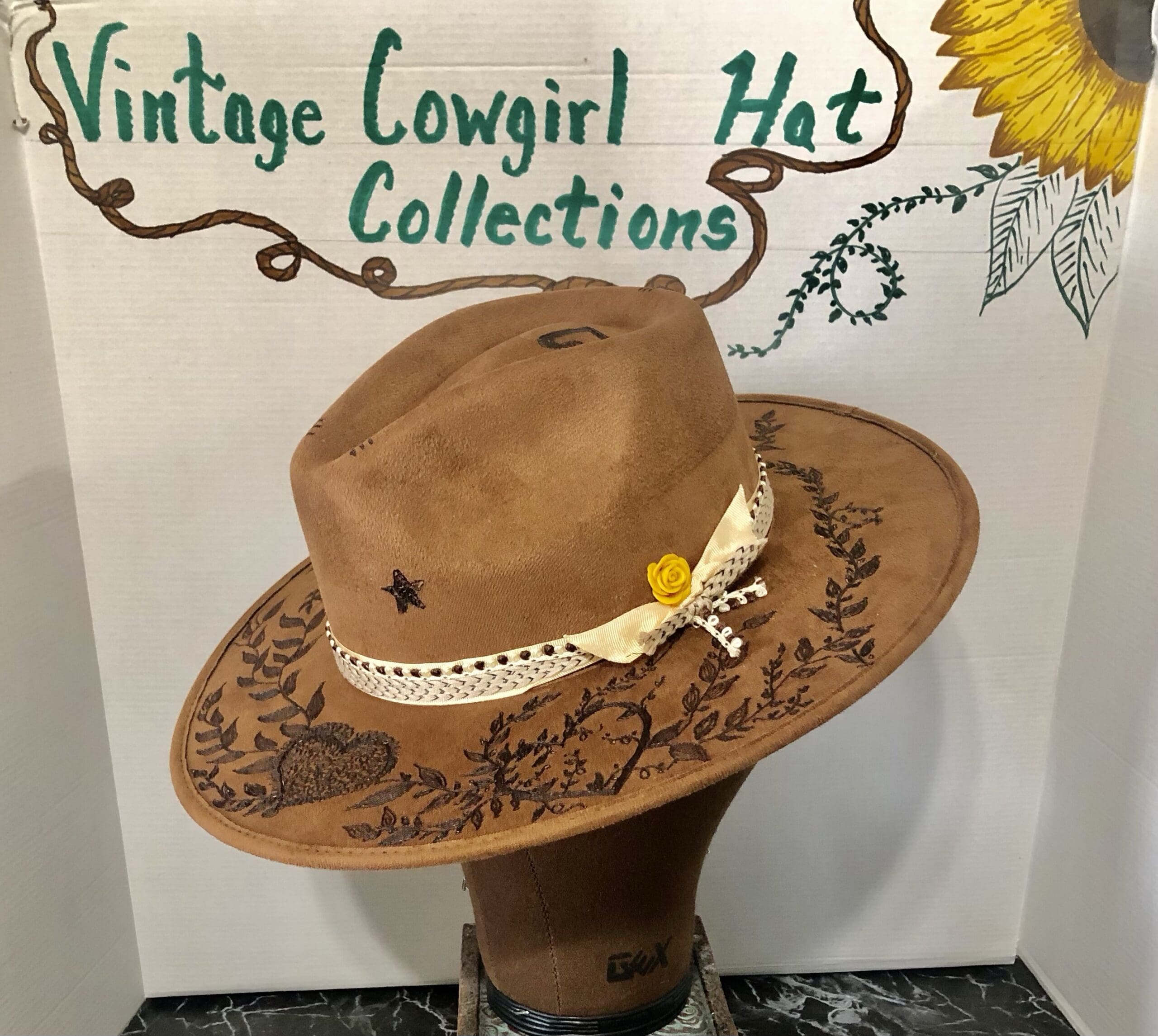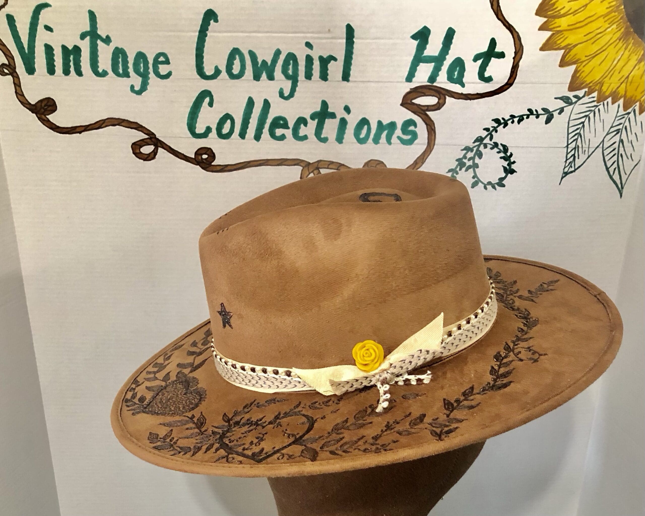 The Yellow Rose of Hearts is a rustic brown vegan suede felt with a new design for Vintage Cowgirl Hat Collections.